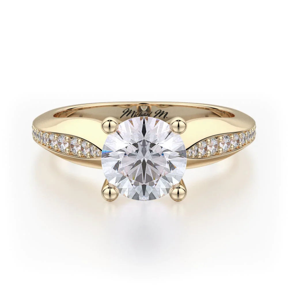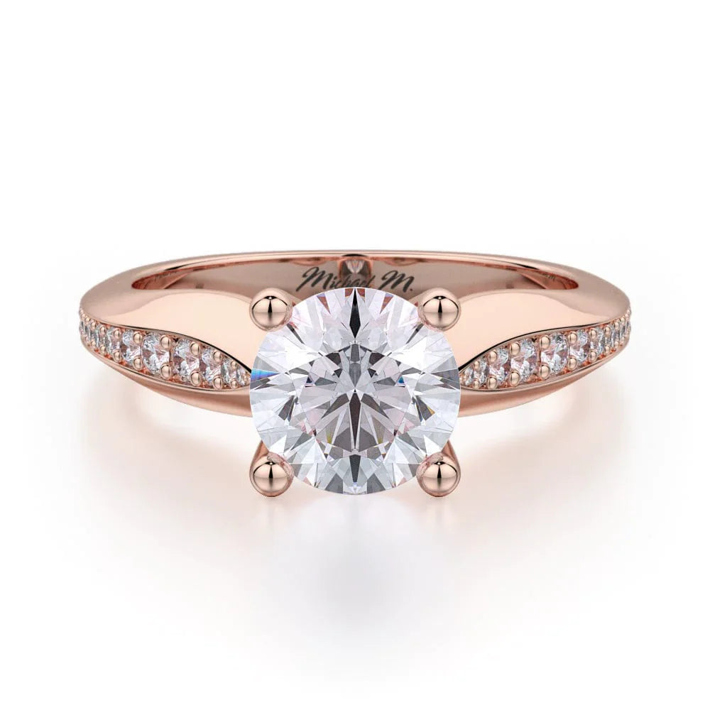 Immaculate Michael M engagement ring with stunning round center diamond setting. Adorned with over 0.16 carats of side diamonds in elegant pave setting. Crafted with exquisite 18-karat white gold for timeless beauty.