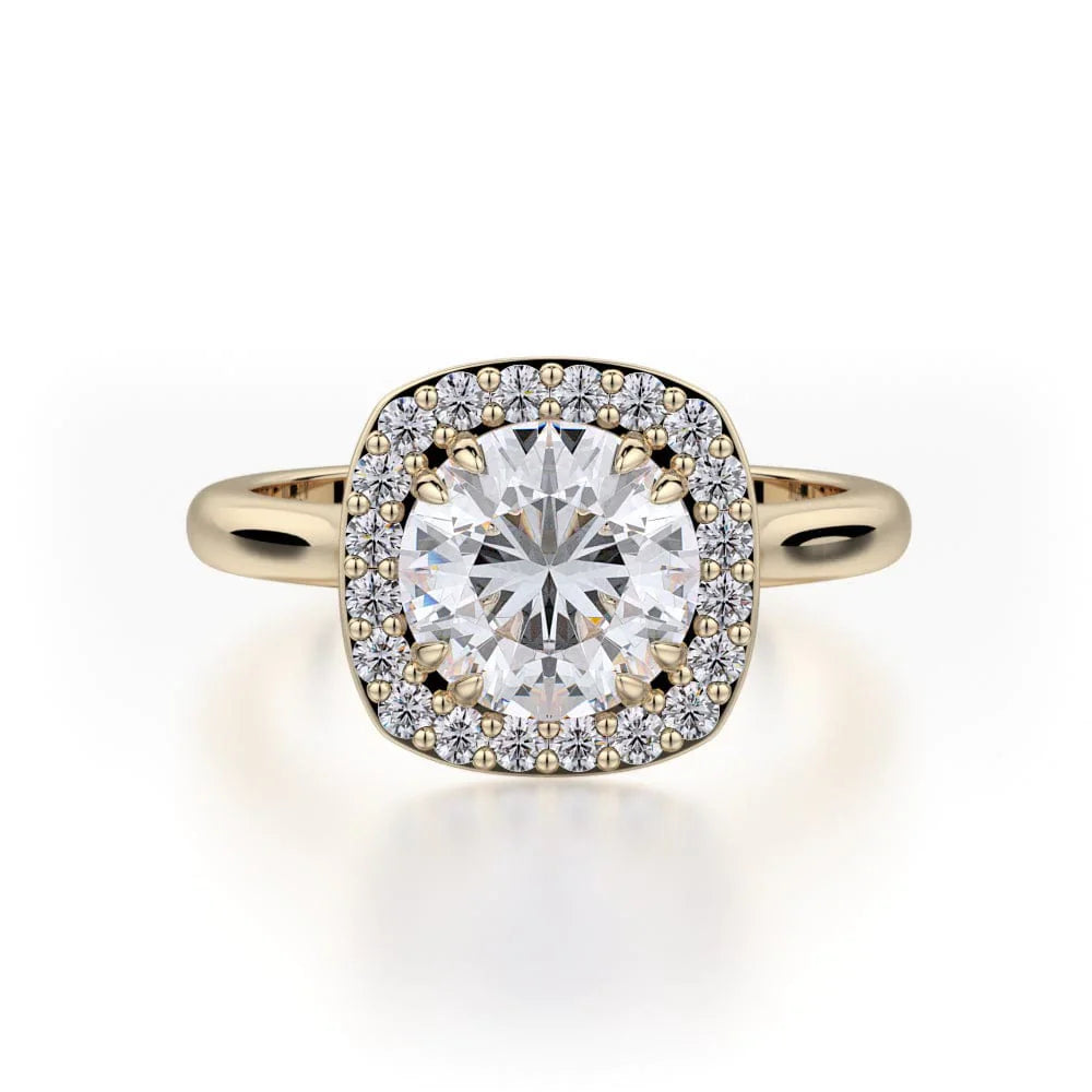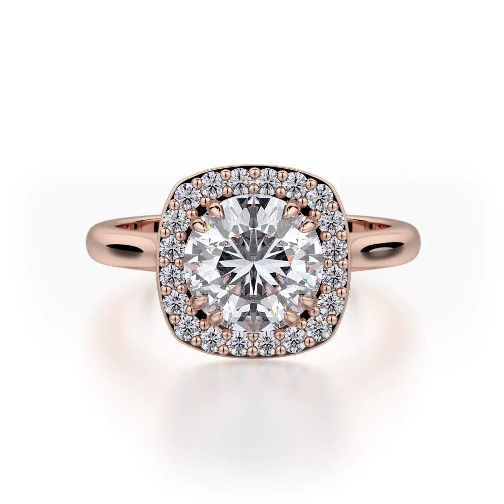 Experience the elegance of Defined R721-1.5, a stunning engagement ring featuring a round center stone held by delicate prongs. With a cushion halo and sparkling diamonds, this handcrafted ring is available in 18K Rose Gold, White Gold, Yellow Gold, or Platinum. Price excludes center stone.
