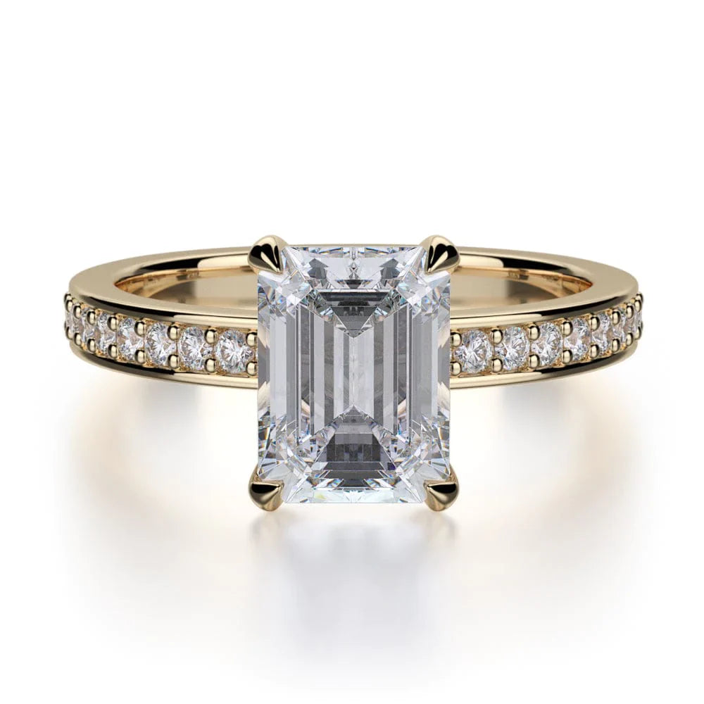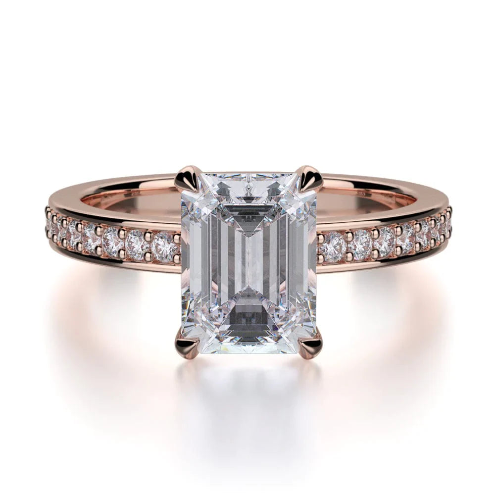 Elegant emerald-cut diamond ring with small, prong-set diamonds on a solid shank. Modern gallery design elevates this classic piece. Available in 18K Rose Gold, White Gold, Yellow Gold, or Platinum. Center stone not included. Handcrafted to order.