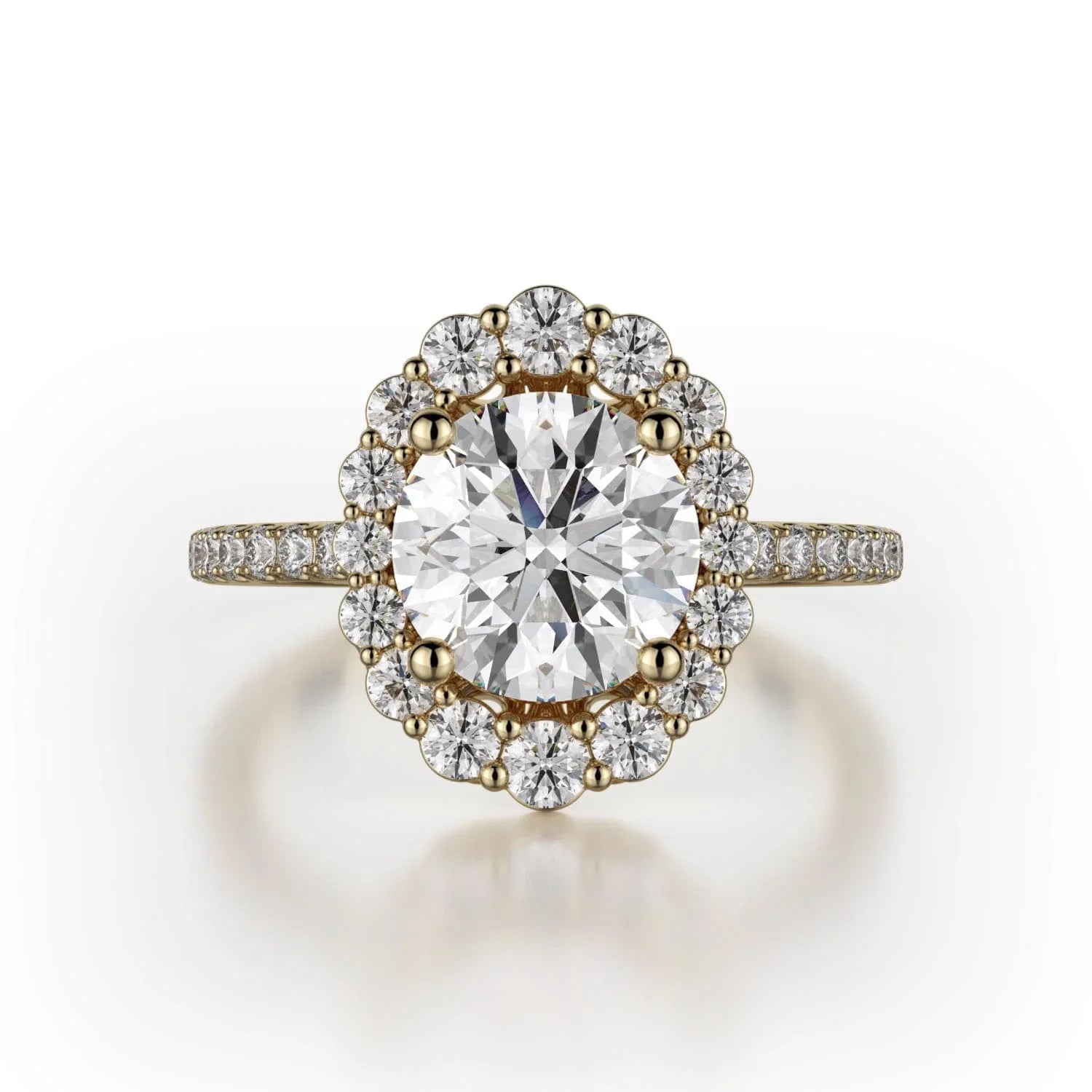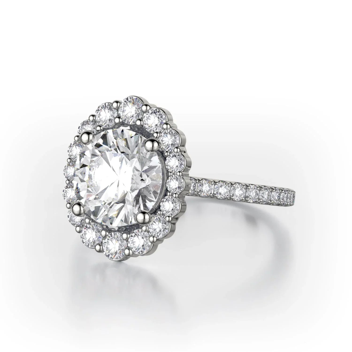 Elegantly redefine tradition with the Botanic-inspired DEFINED R739-1.5 Engagement Ring. Featuring a Brilliant Round Diamond with a Graduated Halo and cathedral-style band adorned with U-set diamonds. Customize with your preferred center stone for a timeless and unique piece.