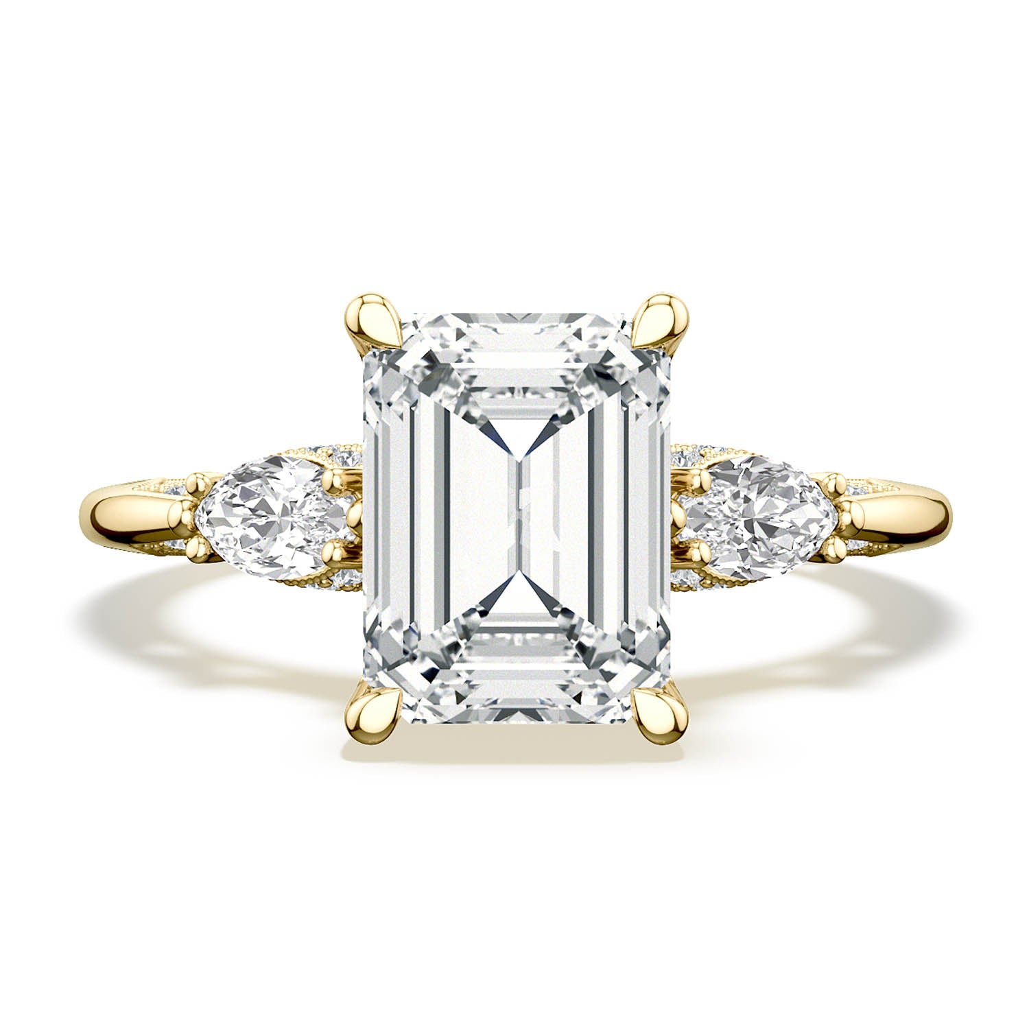A modern twist to a classic three-stone style by featuring marquise diamonds. A Catherdral foundation with raised Tacori crescents on the shoulders and milgrain beading outlining each area, this ring elegantly shines from every angle.