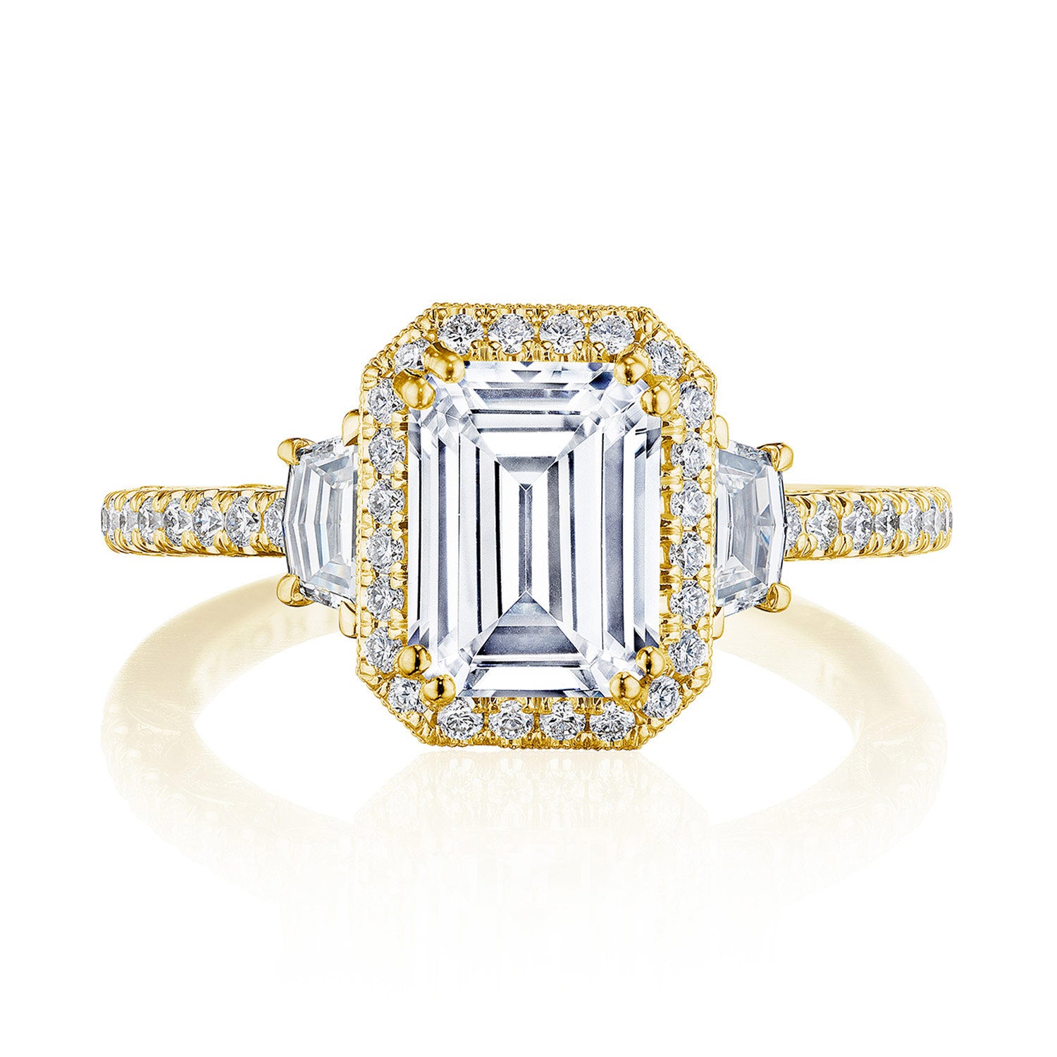 This elegant three-stone setting is exceptionally detailed. A Spotlight Bloom with radiant Cadillac side stones sit atop a meticulous French pavé band with lace-like, milgrain-edged Dantela Crescent Fabric.
