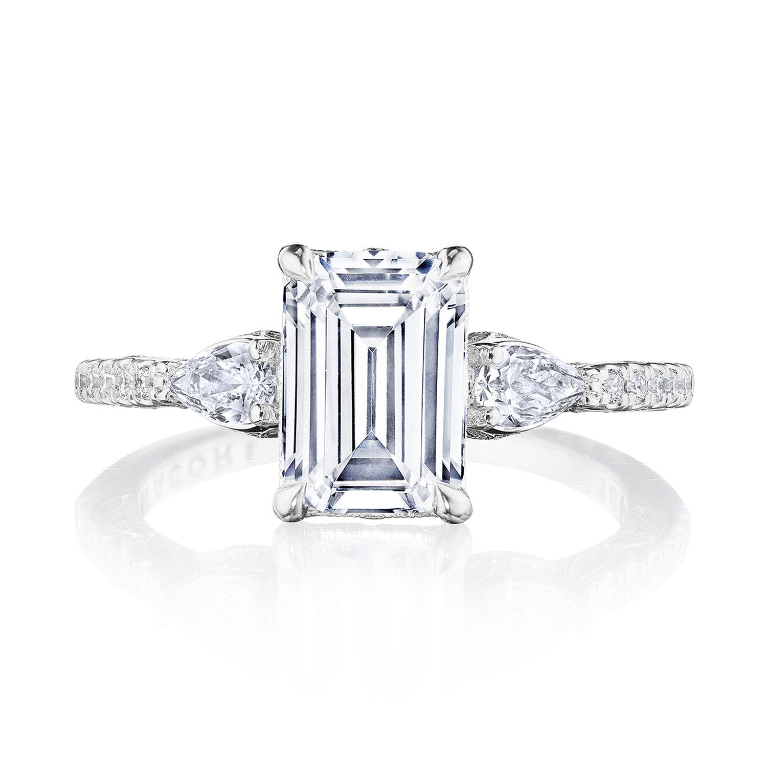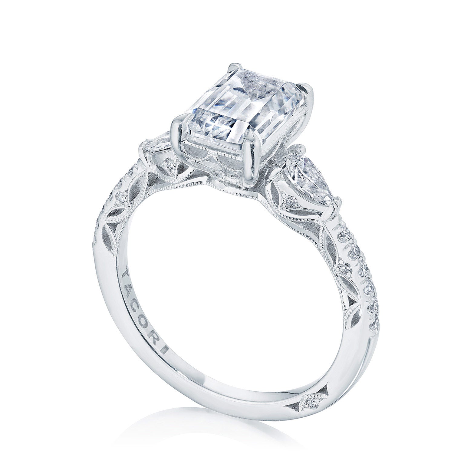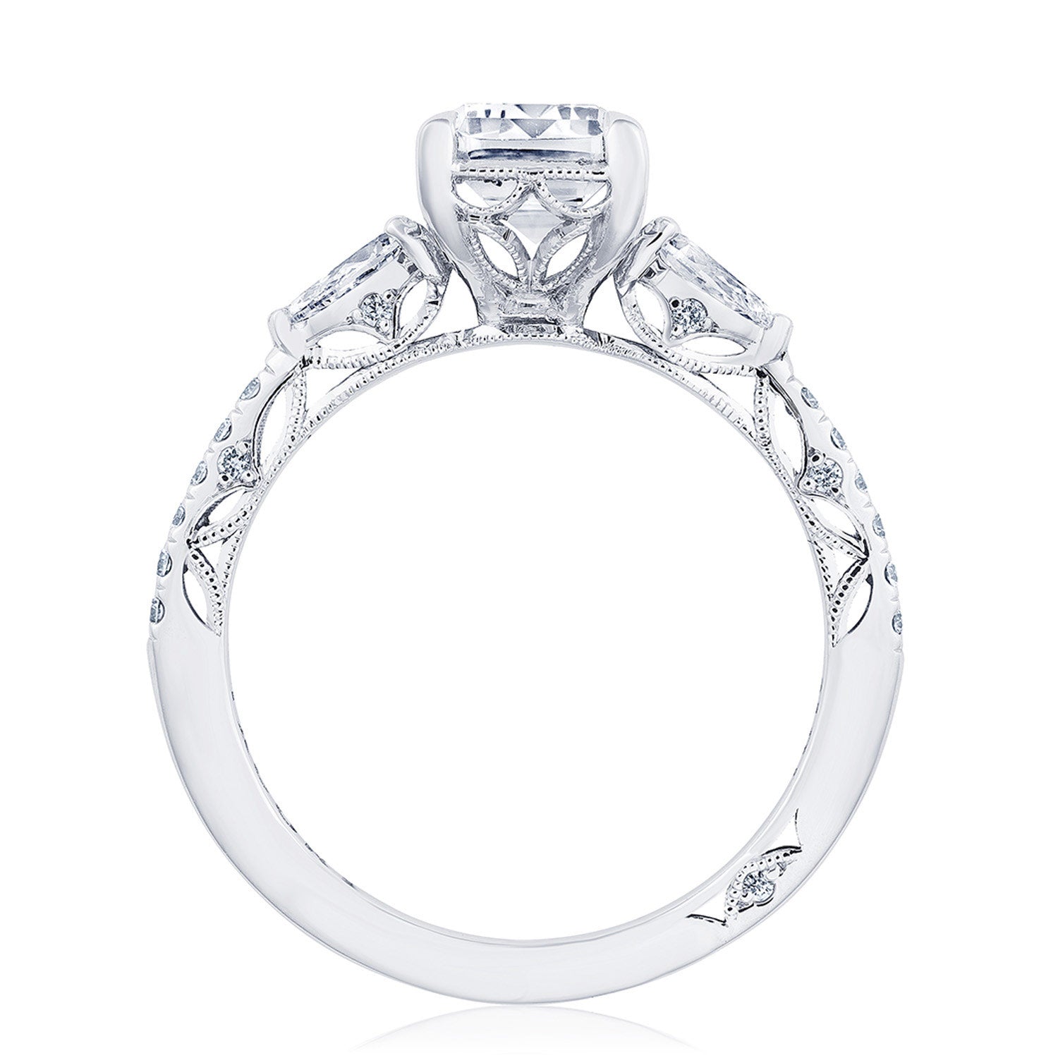 This three stone ring features distinctive pear side stones that sit atop a lace-like crown and foundation of complex, milgrain-edged Dantela Crescent Fabric. Meticulous, hand-set French pavé leads up the ceiling for eye-catching brilliance.