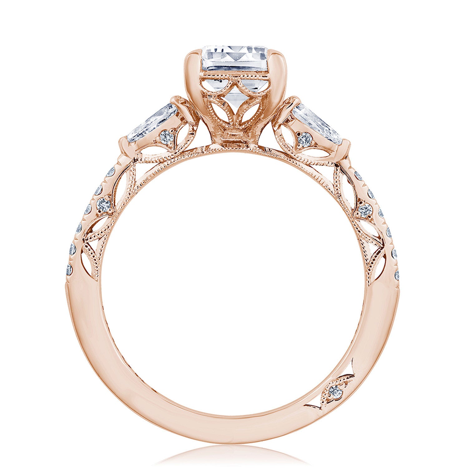 This three stone ring features distinctive pear side stones that sit atop a lace-like crown and foundation of complex, milgrain-edged Dantela Crescent Fabric. Meticulous, hand-set French pavé leads up the ceiling for eye-catching brilliance.