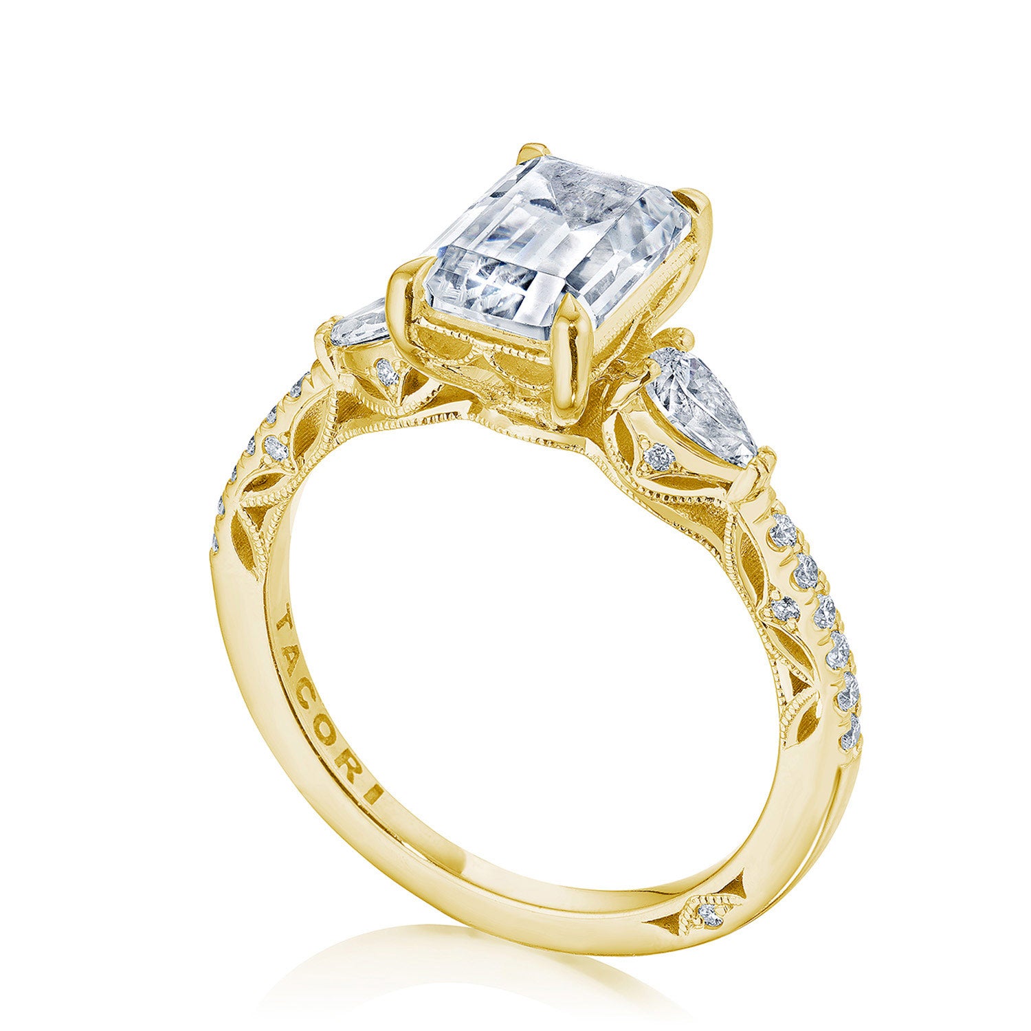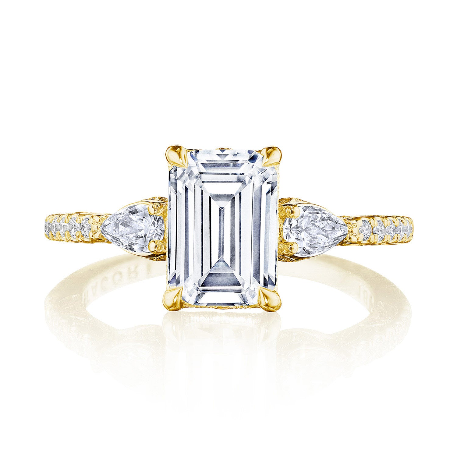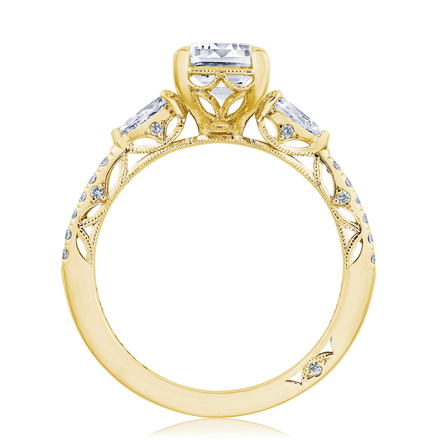 This three stone ring features distinctive pear side stones that sit atop a lace-like crown and foundation of complex, milgrain-edged Dantela Crescent Fabric. Meticulous, hand-set French pavé leads up the ceiling for eye-catching brilliance.