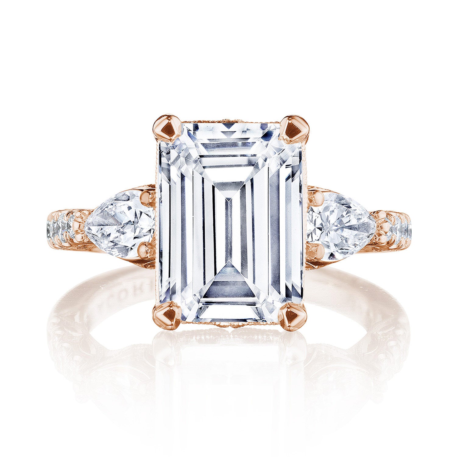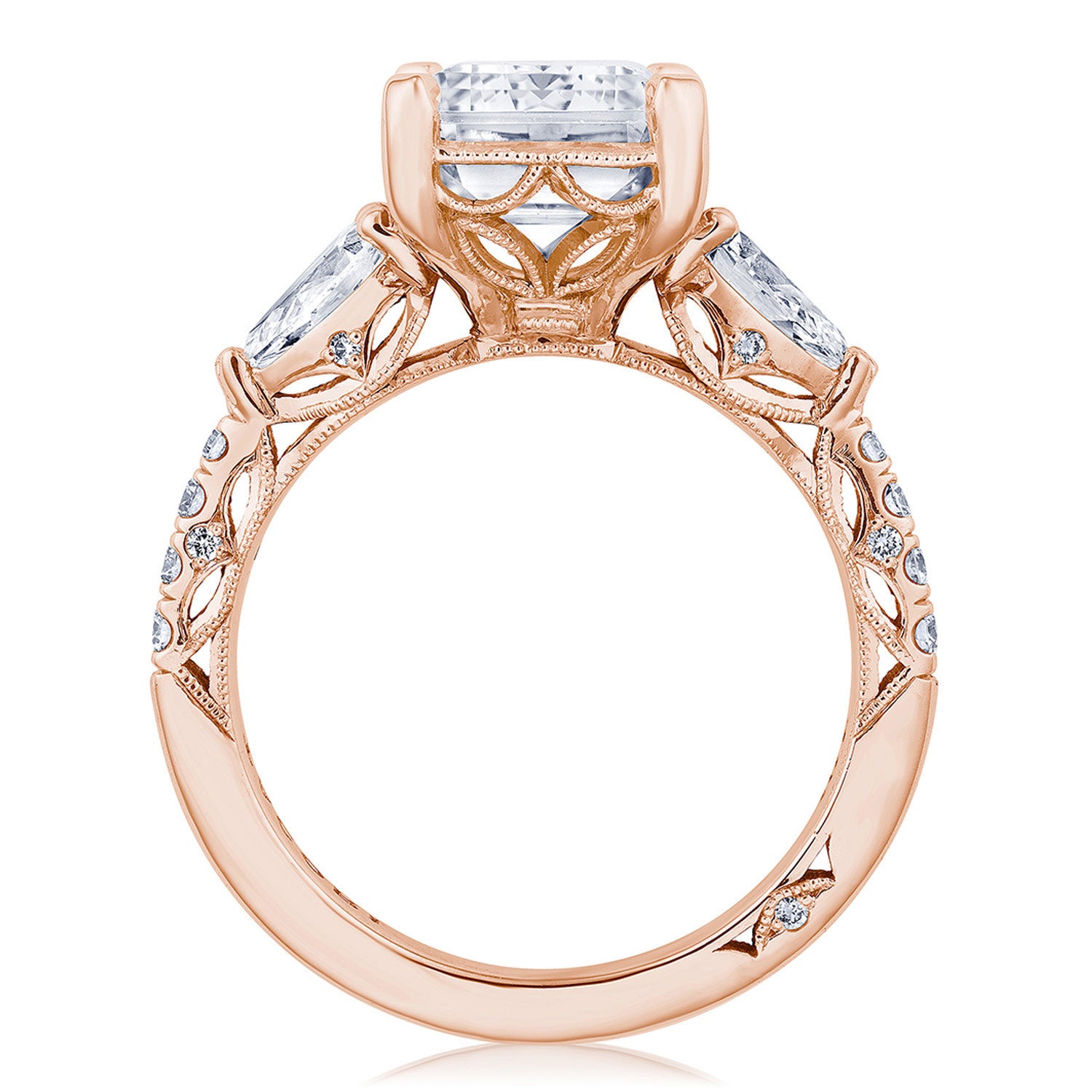 This three stone ring features distinctive pear side stones that sit atop a lace-like crown and foundation of complex, milgrain-edged Dantela Crescent Fabric. Meticulous, hand-set French pavé leads up the ceiling for eye-catching brilliance.