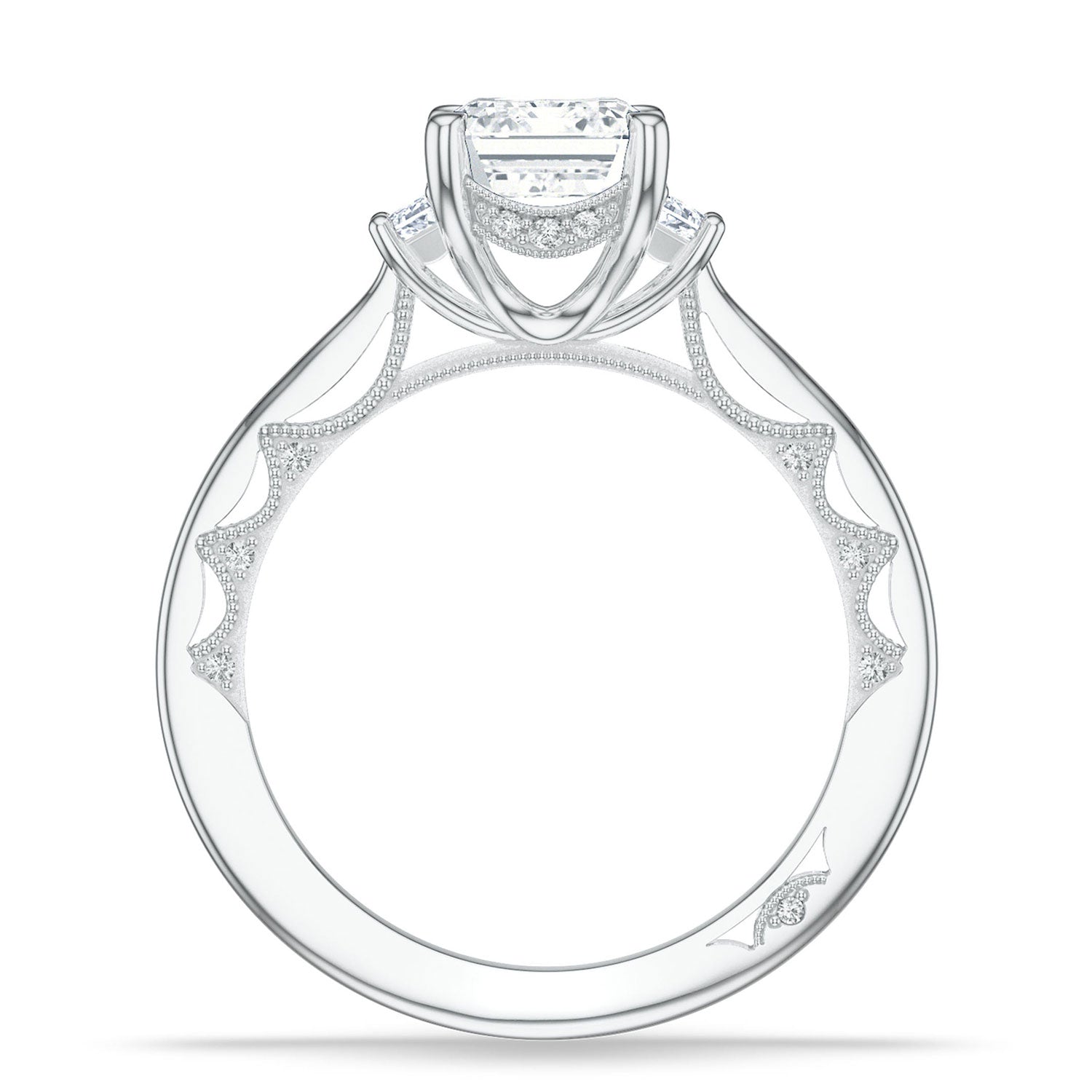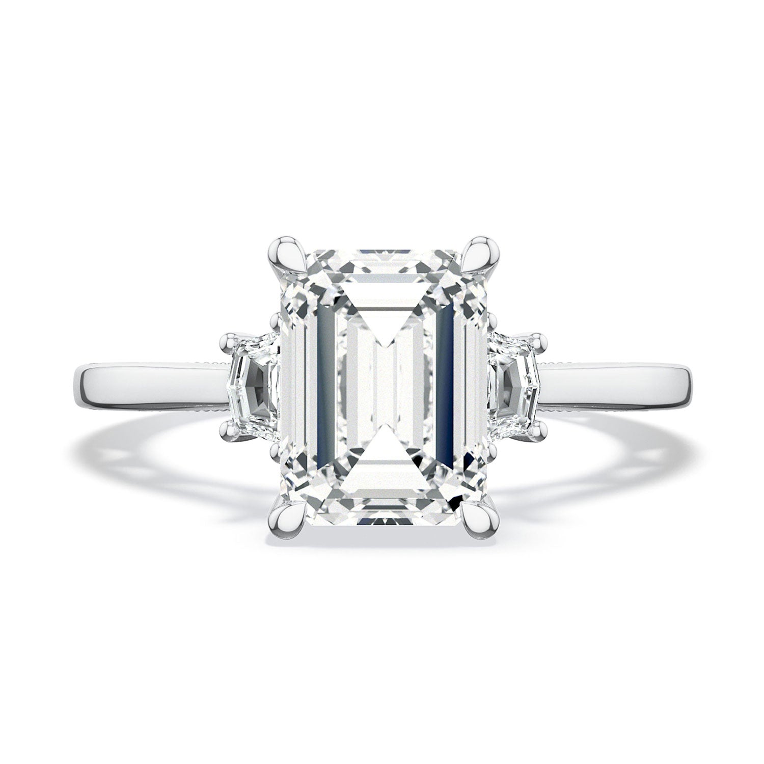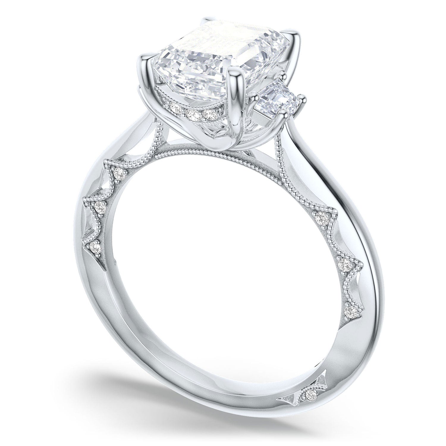 Milgrain-edged Crescents create radiant windows of light, while round-brilliant diamonds at each Crescent junction are hand-set with triple beading. A high polish ceiling leads towards the three-stone crown with a hidden bloom.