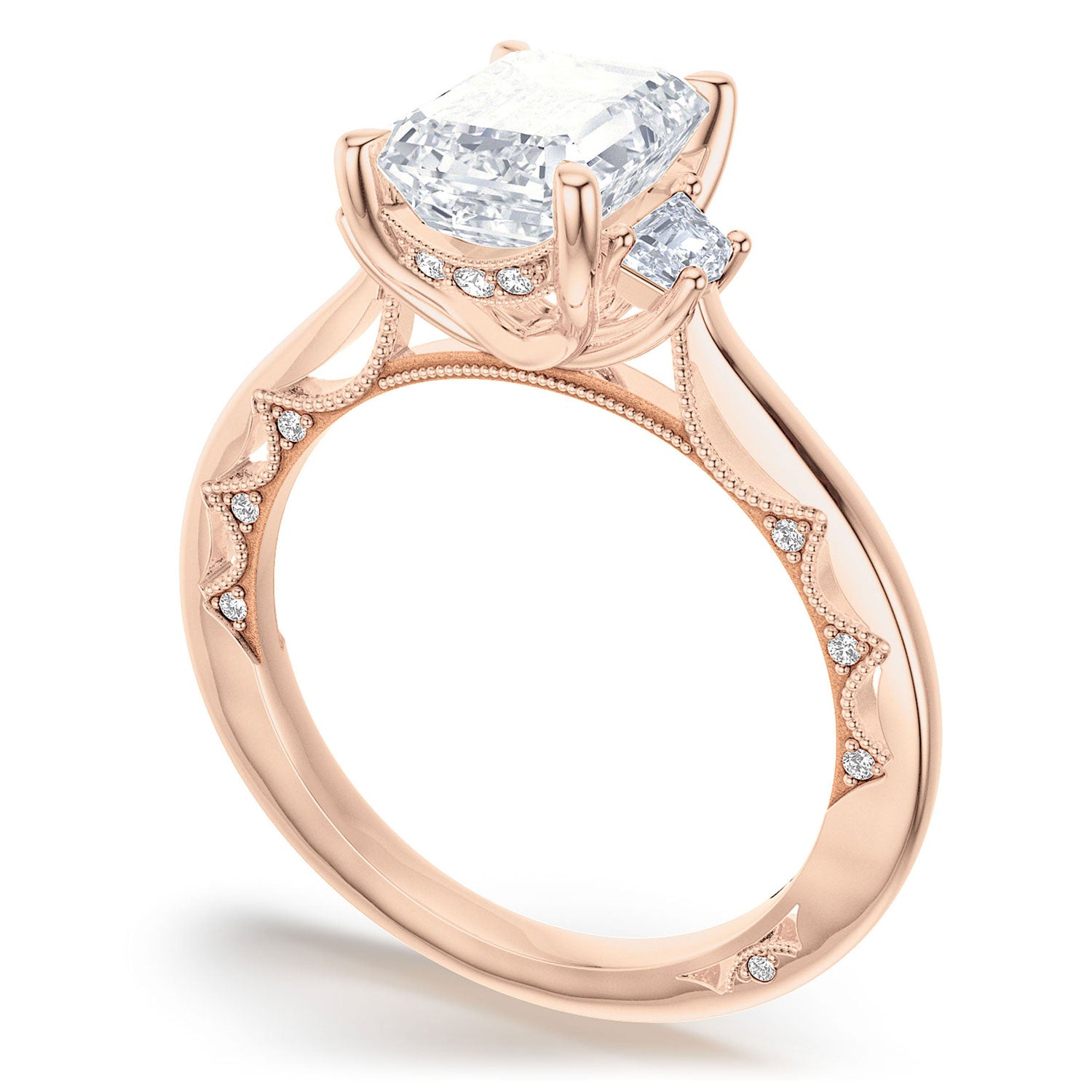 Milgrain-edged Crescents create radiant windows of light, while round-brilliant diamonds at each Crescent junction are hand-set with triple beading. A high polish ceiling leads towards the three-stone crown with a hidden bloom.