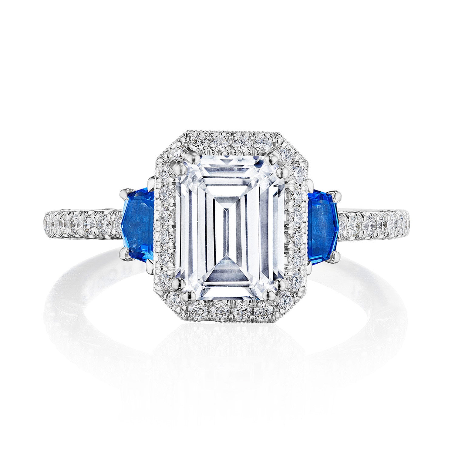 Emerald 3-Stone Engagement Ring with Blue Sapphires