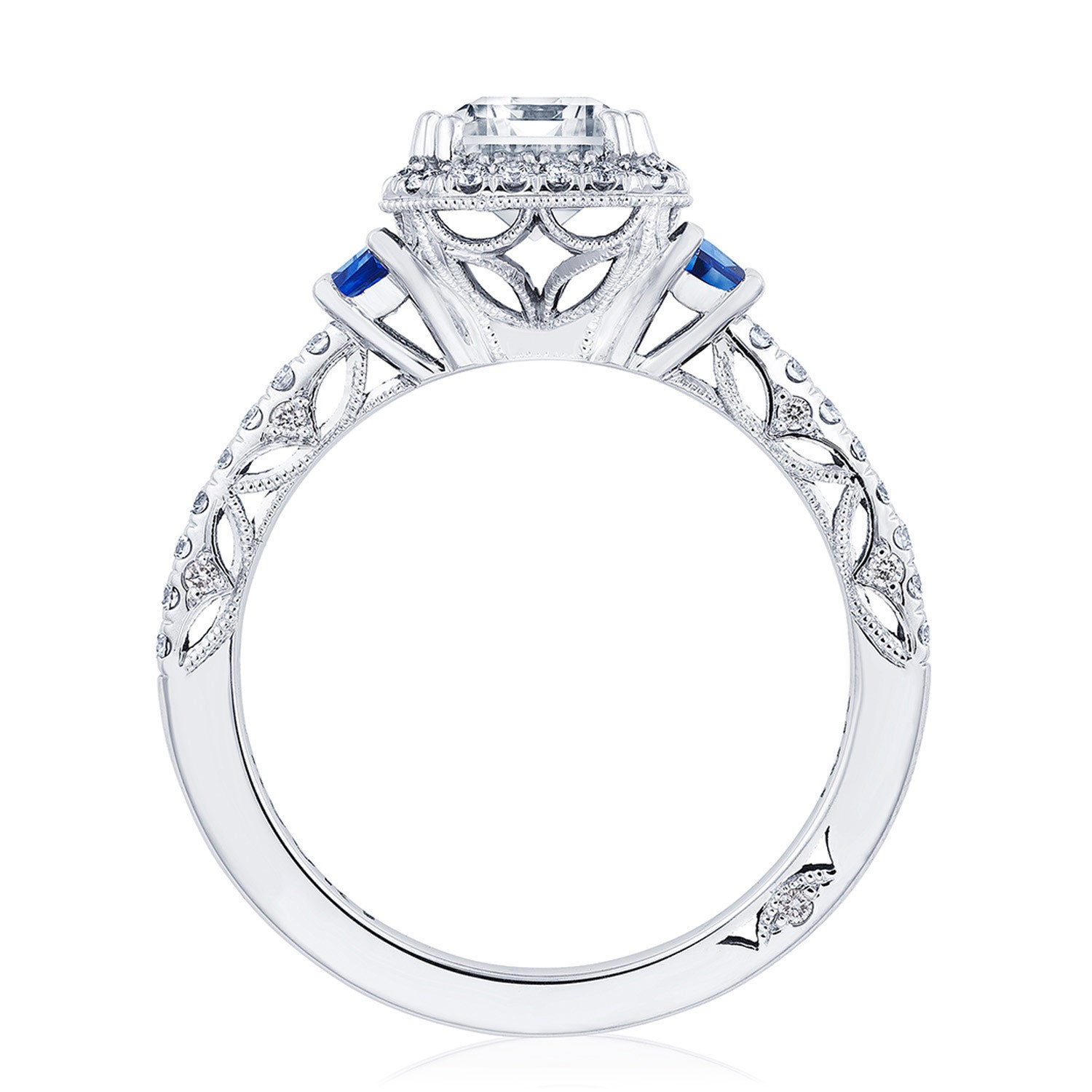 This elegant three-stone setting is exceptionally detailed. A Spotlight Bloom with blue sapphire Cadillac-cut side stones sit atop a meticulous French pavé band enhanced by the lace-like, Dantela Crescent Fabric.