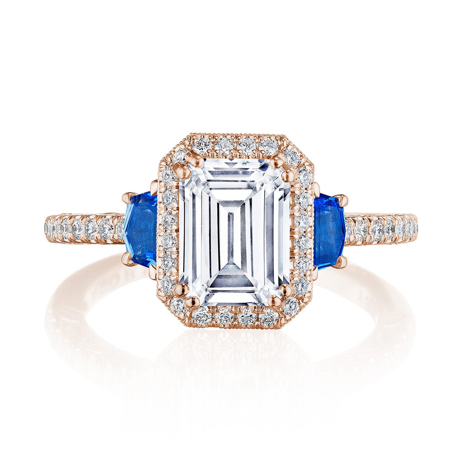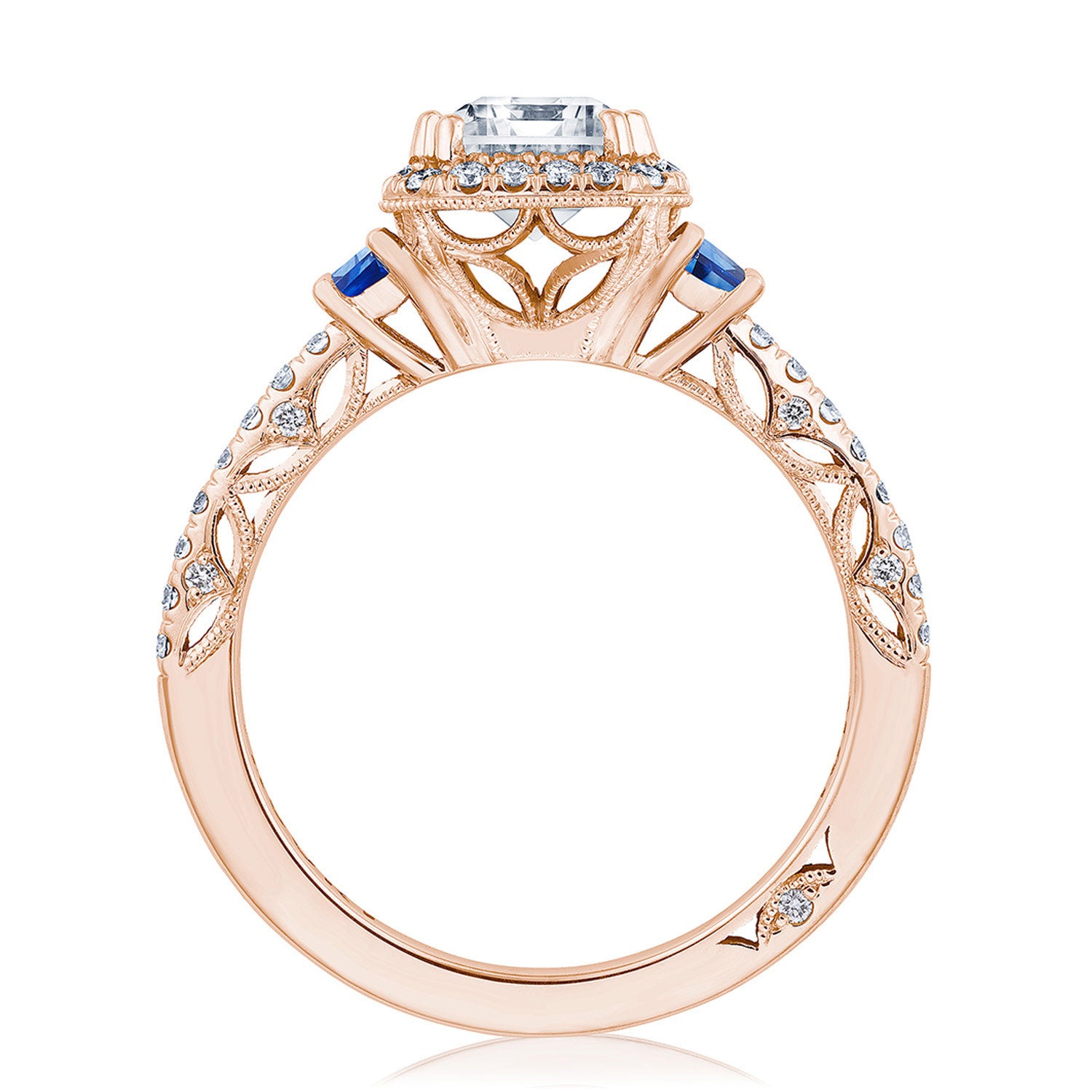 This elegant three-stone setting is exceptionally detailed. A Spotlight Bloom with blue sapphire Cadillac-cut side stones sit atop a meticulous French pavé band enhanced by the lace-like, Dantela Crescent Fabric.