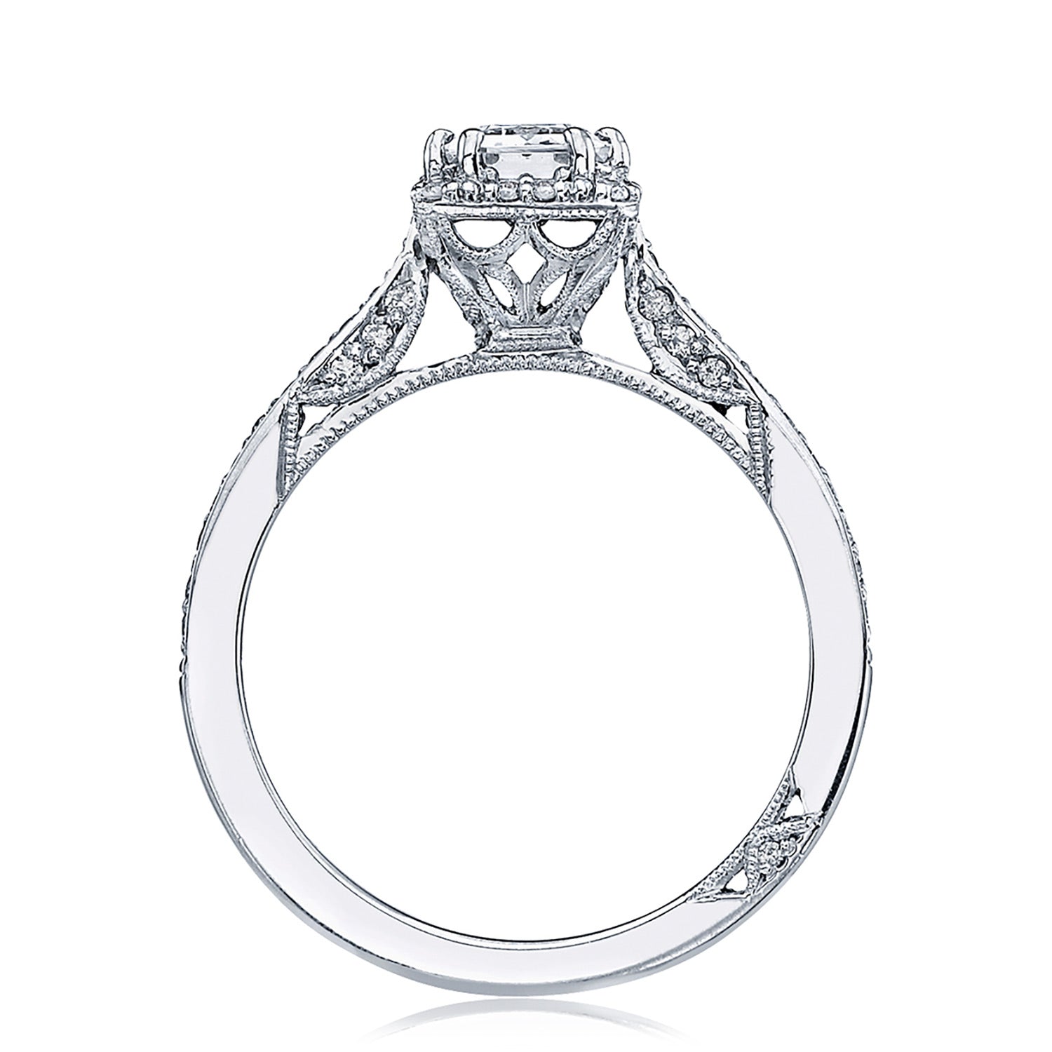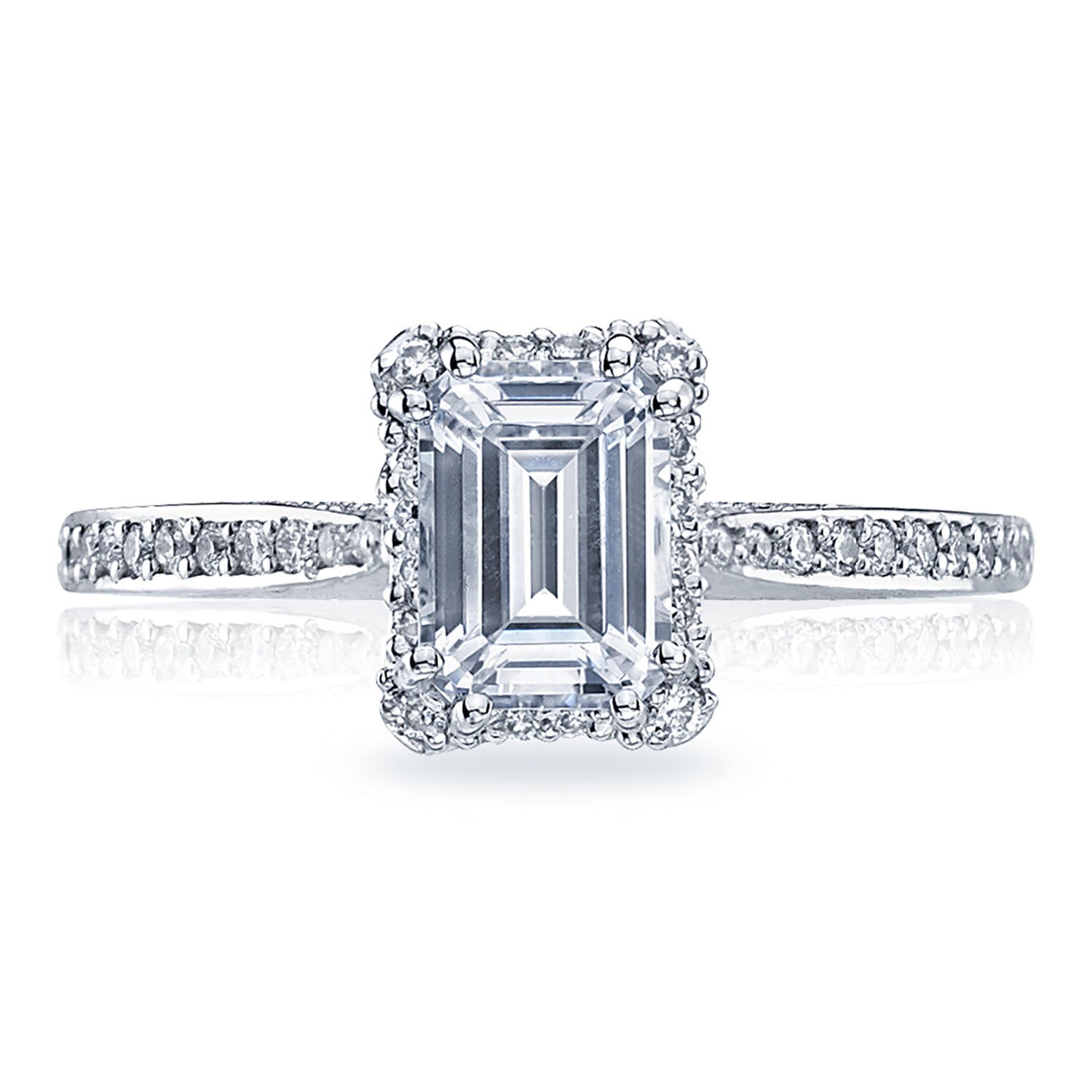 Spotlight diamonds give depth and dimension to an emerald cut center with diamonds adorning the lower level of the crown, hand set in pavé along the ceiling, and glittering in Tacori crescent details along the sides of a high polished band.