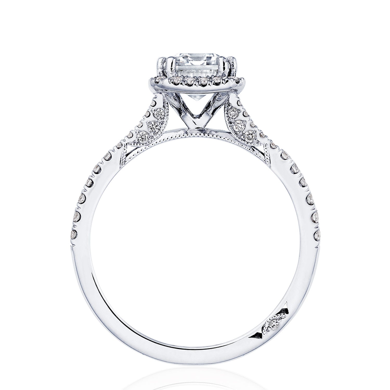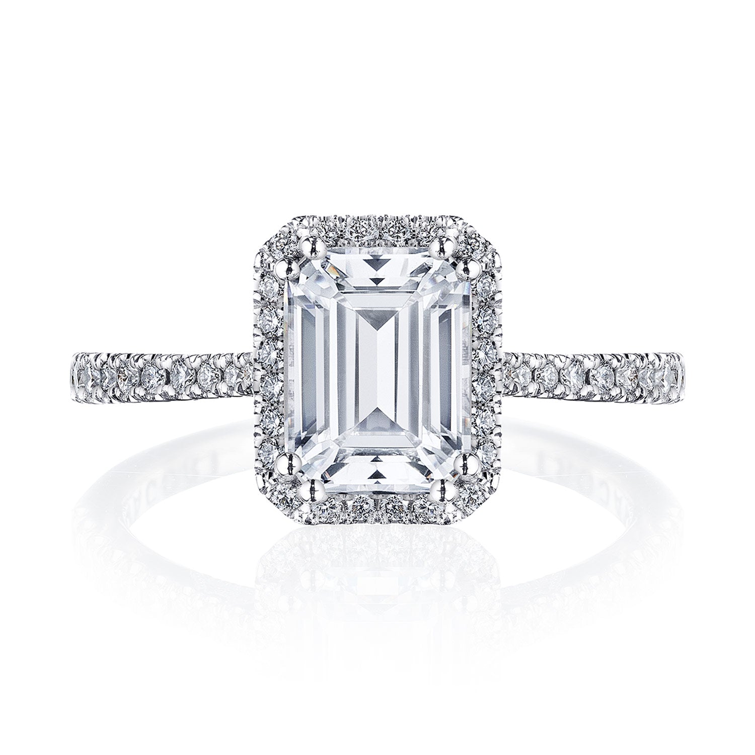 A thin, Simply Tacori Cathedral foundation that delivers brilliant detail, crowned with an emerald cut center and emerald shaped bloom. Truly Tacori and totally lovely.