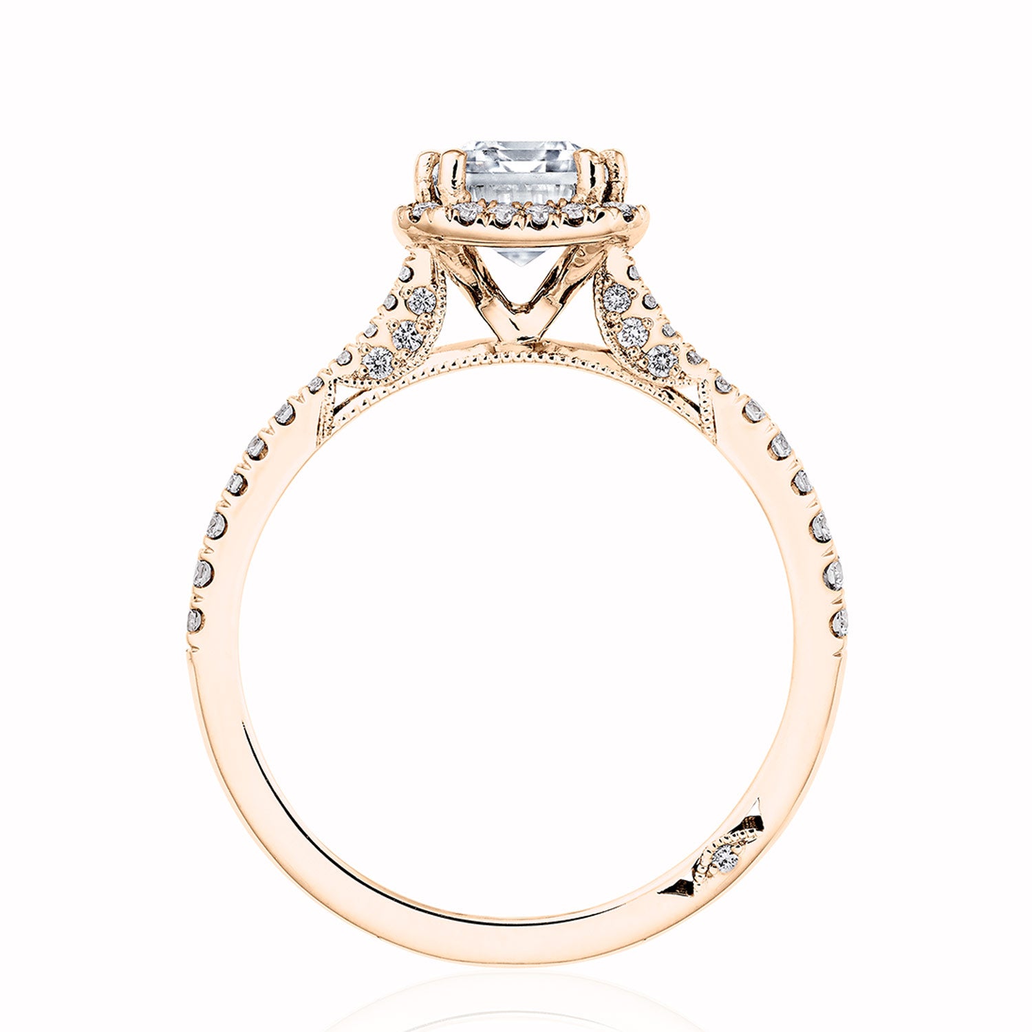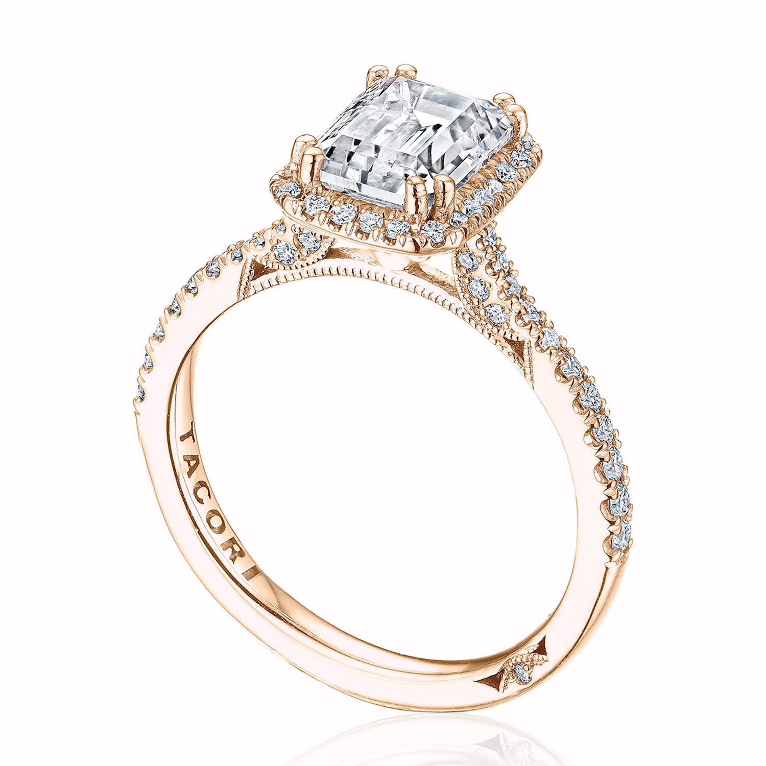 A thin, Simply Tacori Cathedral foundation that delivers brilliant detail, crowned with an emerald cut center and emerald shaped bloom. Truly Tacori and totally lovely.
