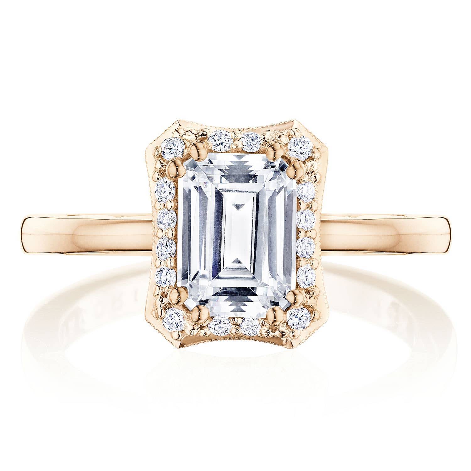Love in bloom. The beauty in the simplicity of this emerald cut diamond engagement ring is amplified by the Coastal Crescent inner face, with a diamond-cuddled detailing underneath the crescent.