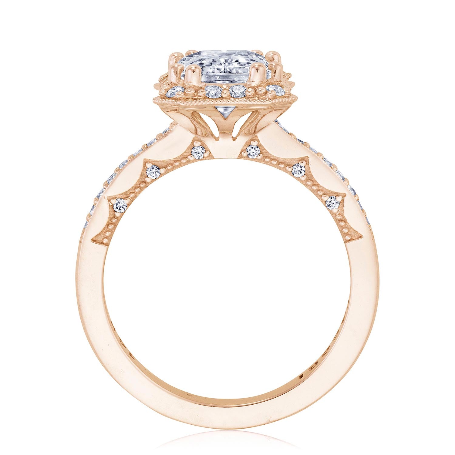 An emerald cut diamond solitaire is brought to life by a bloom of diamonds and rests gently on a diamond band. This ring features the Coastal Crescent inner face with pinpoint diamond details for a truly regal look.