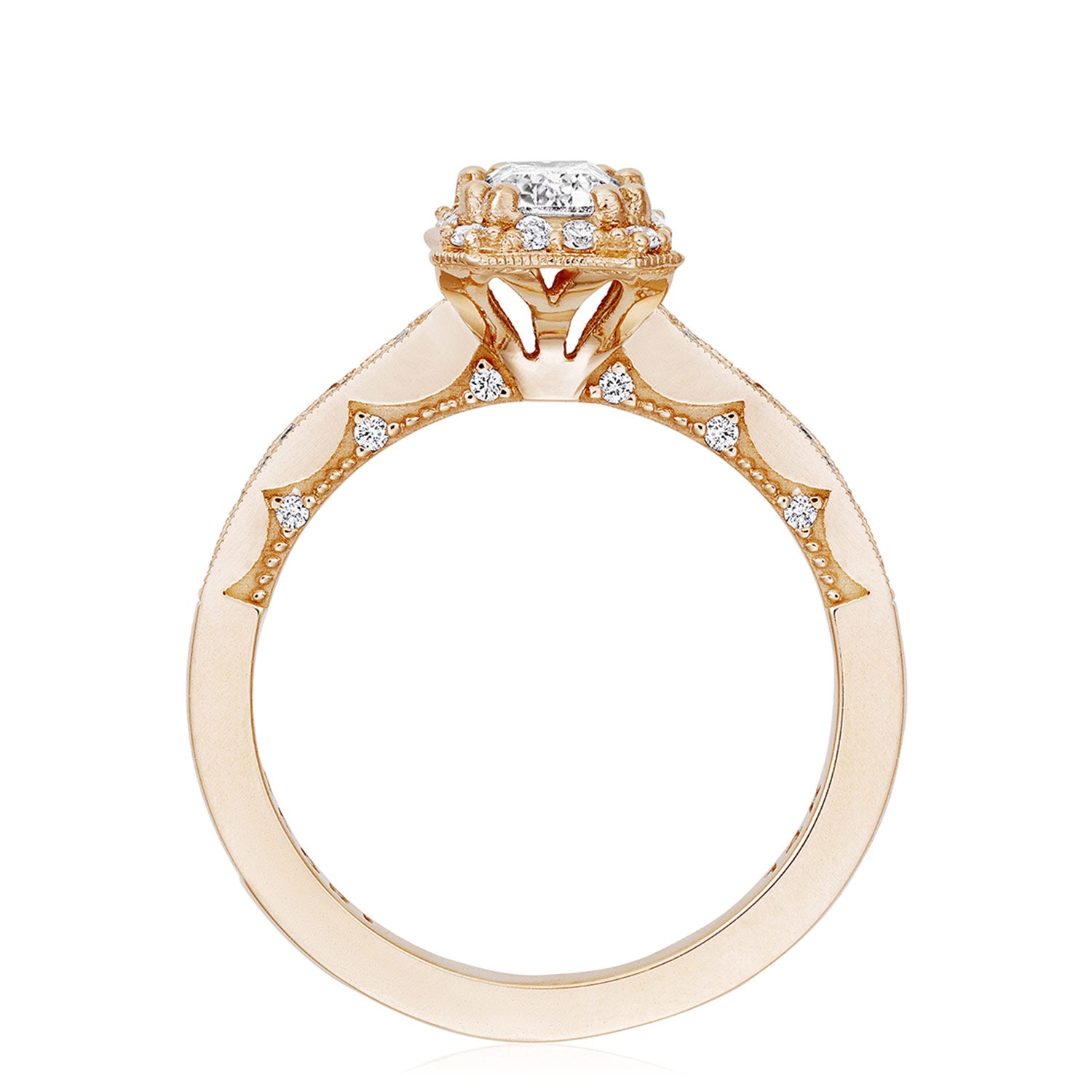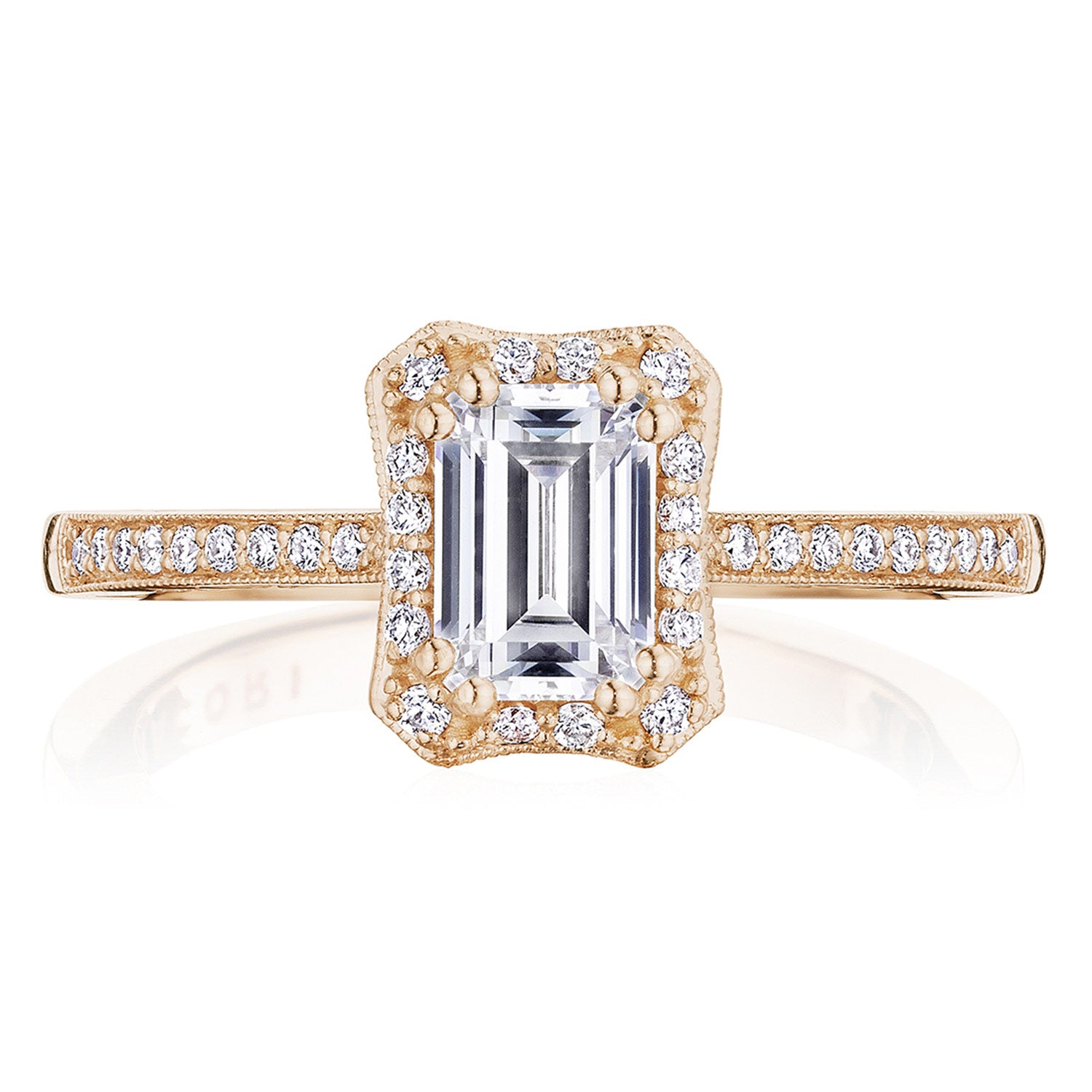 An emerald cut diamond solitaire is brought to life by a crown of diamonds and rests gently on a diamond band. This ring features the Coastal Crescent inner face with pinpoint diamond details for a truly regal look.