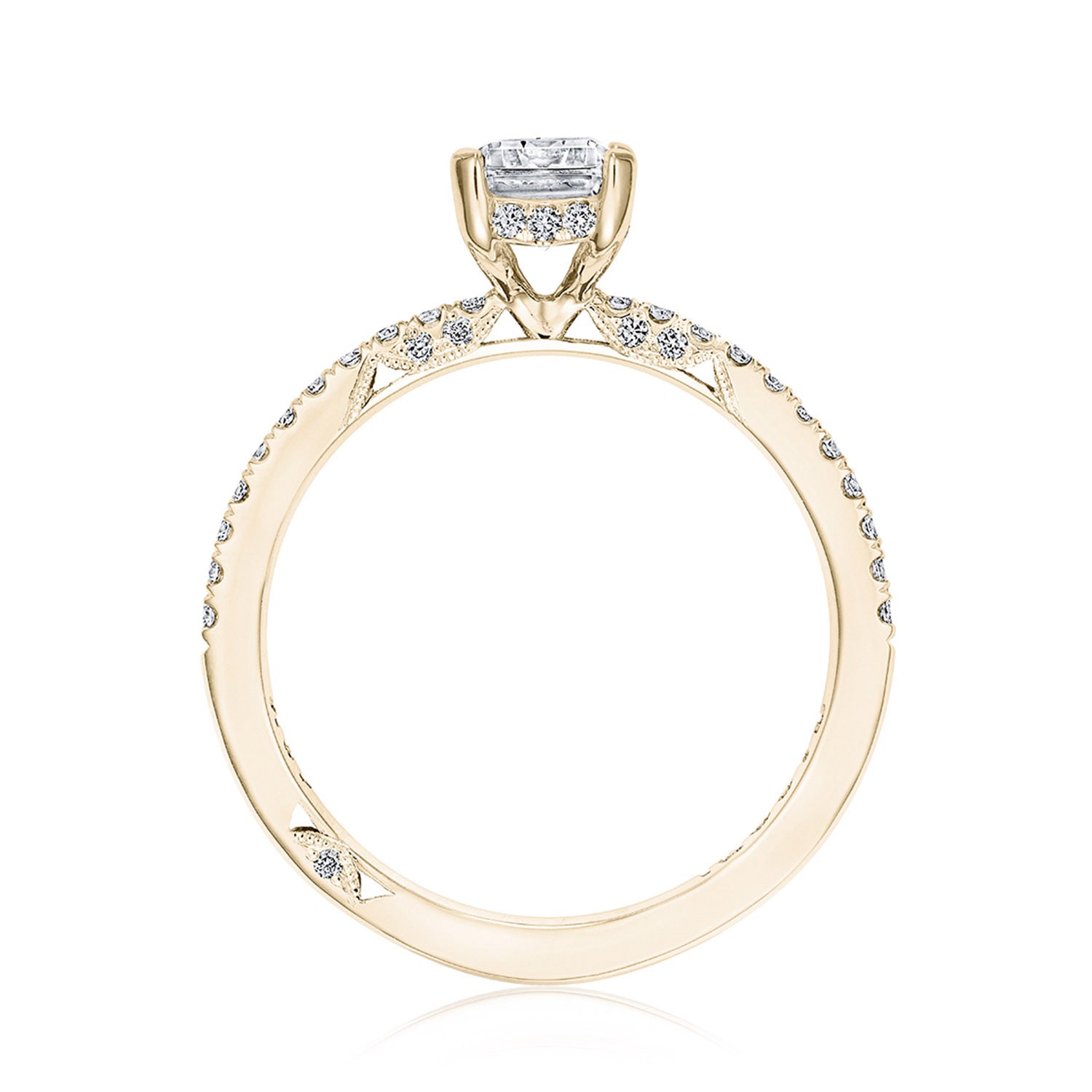 Strong solitaire look with a thin band that delivers brilliant detail- this Truly T varietal of Simply Tacori features a 360 foundation with French pavé set diamonds on the band and is perfect for the modern bride. Look for the secret diamond inscribed, “T” detail on the setting of the ring.