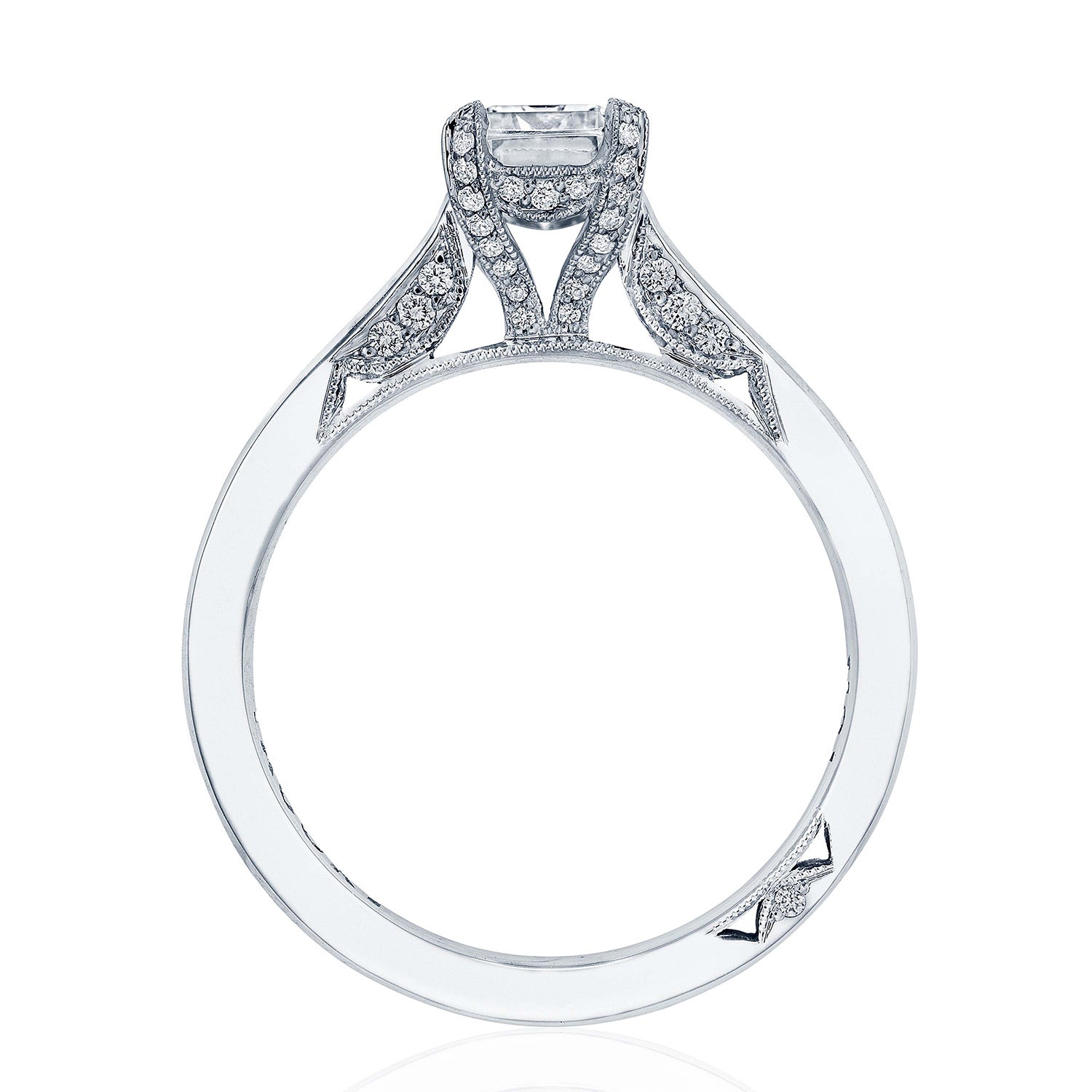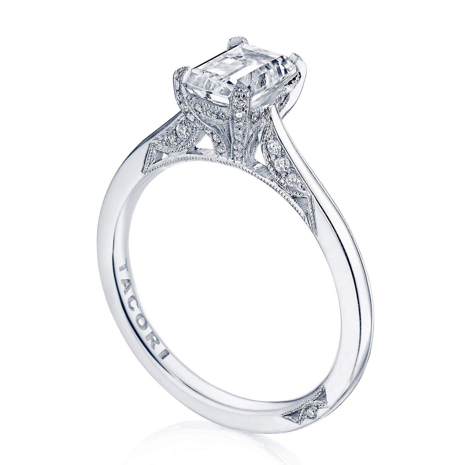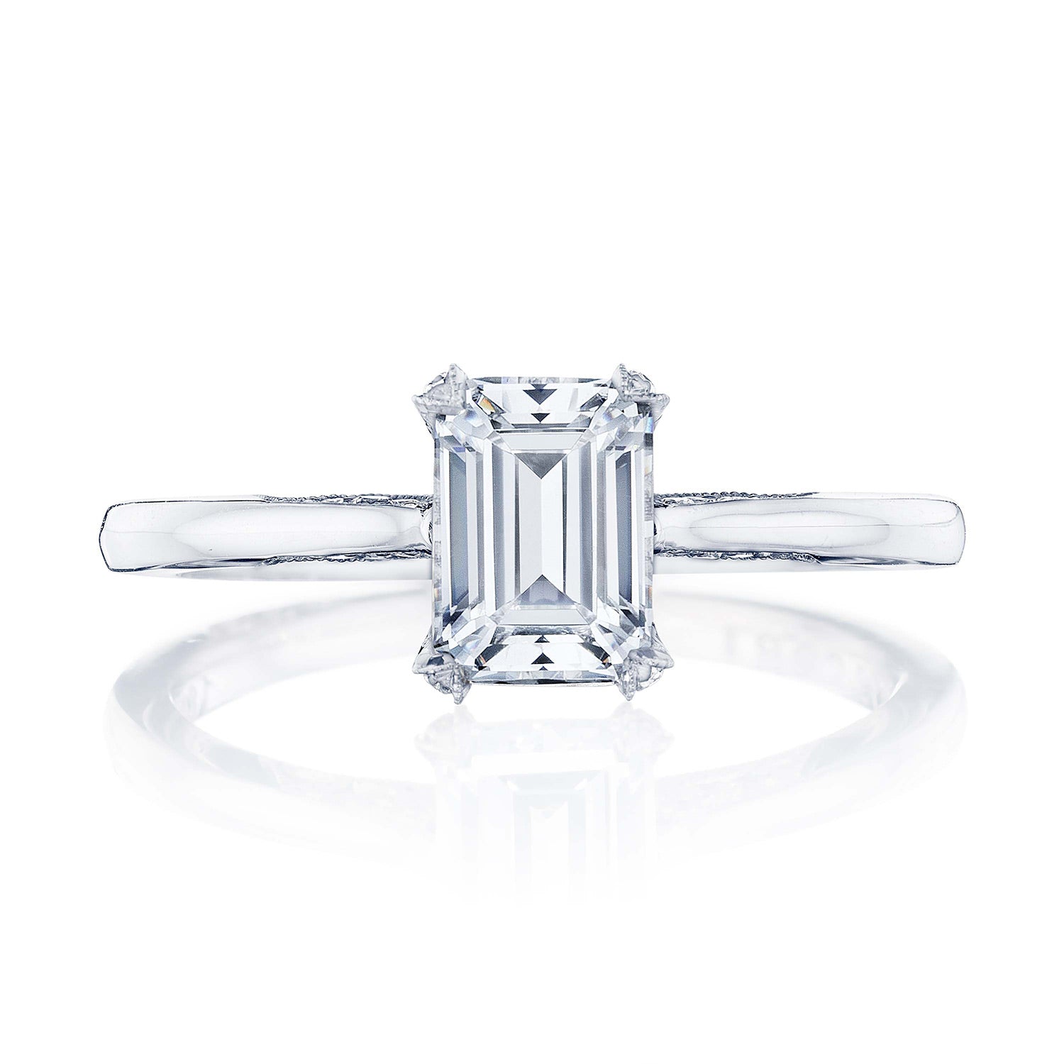 Delicate details and a dainty Cathedral foundation. This Simply Tacori solitaire features an effortlessly modern, hi-polish ceiling and emerald cut center.