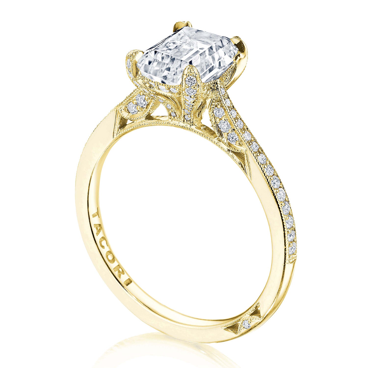 Delicate details and a dainty Cathedral foundation. This Simply Tacori solitaire features a high shine pavé diamond ceiling and emerald cut center.