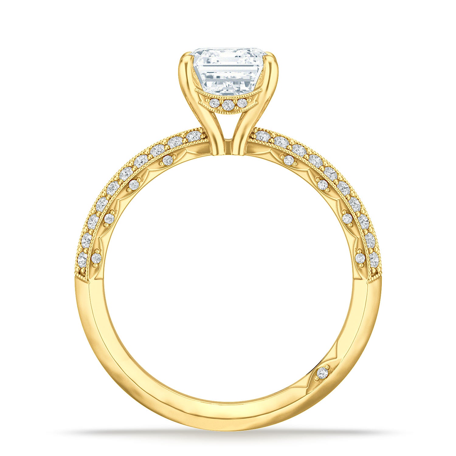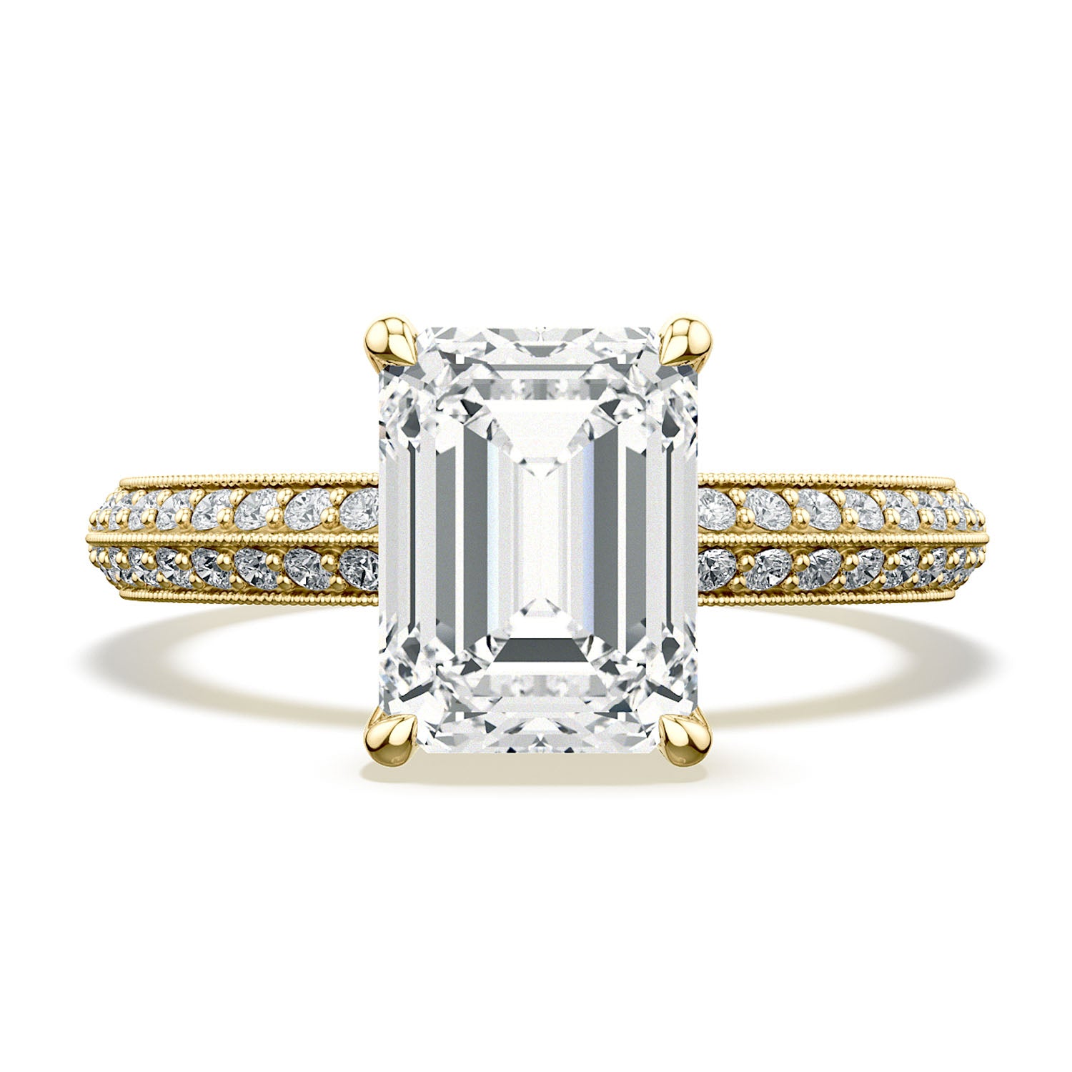 This Knife Edge engagement ring reimagines this classic silhouette with delicate hidden crescents and a beautiful array of pavé diamonds emphasizing the size of the center stone.