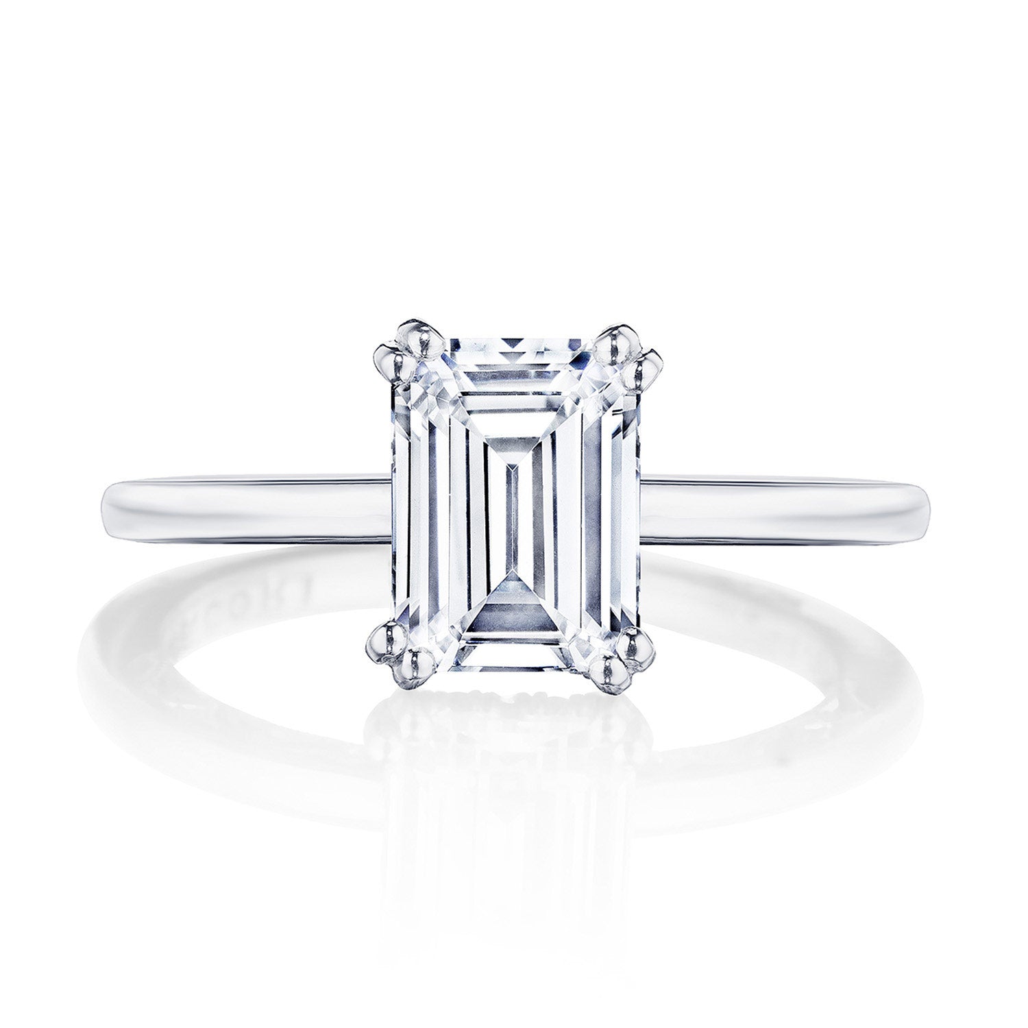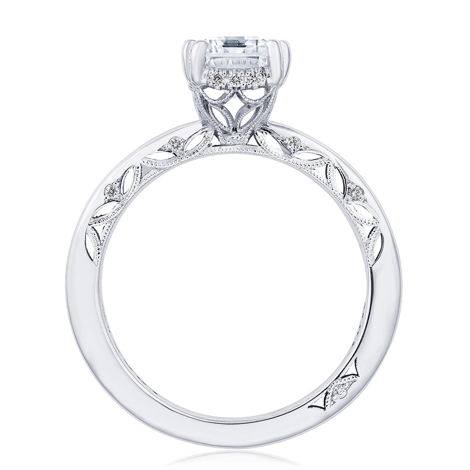 A high-polish ceiling accented with lace-like tracery makes for a stunningly airy setting. The hand-hewn milgrain and pinpoint diamonds add nuance, while a hidden bloom creates dimensional light. A Signature Crescent marks the resting point.