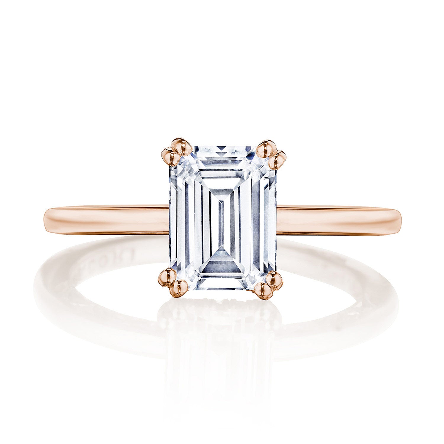 A high-polish ceiling accented with lace-like tracery makes for a stunningly airy setting. The hand-hewn milgrain and pinpoint diamonds add nuance, while a hidden bloom creates dimensional light. A Signature Crescent marks the resting point.