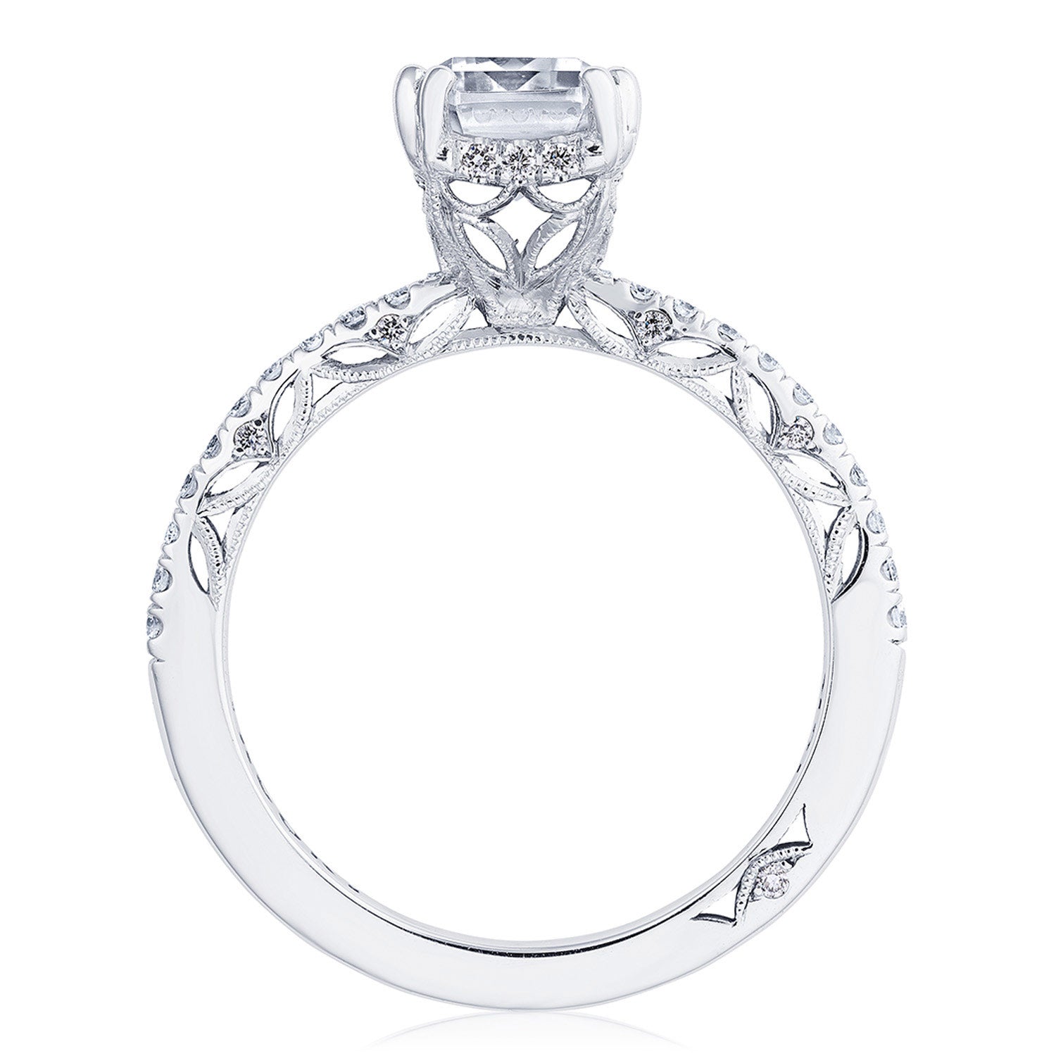 A French pavé ceiling adds dimensional light, while a hidden bloom and open air crown work illuminates the center stone. A complex and alluring lace-like Crescent Fabric gives stunning texture to the inner face profile.