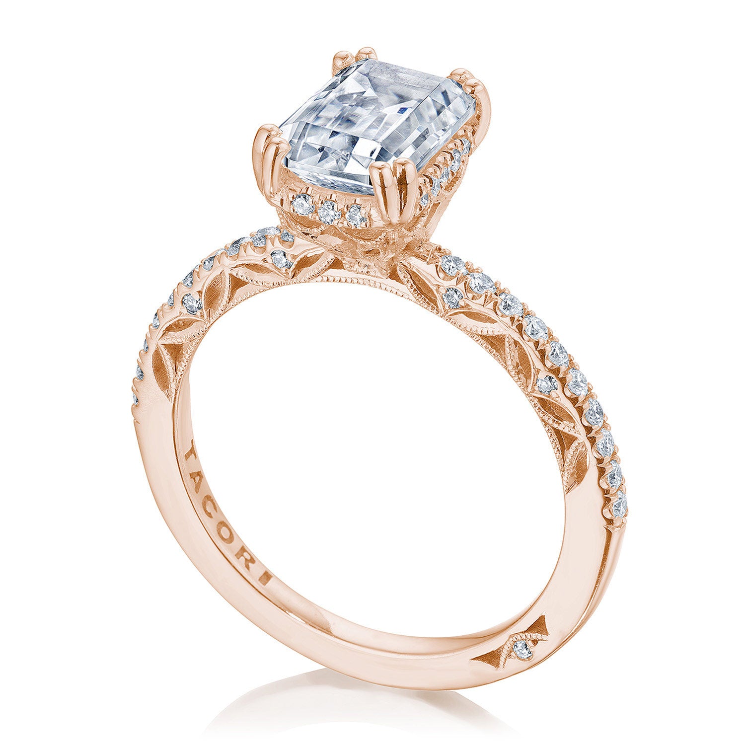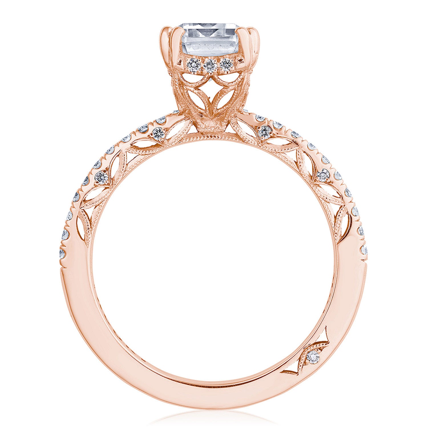 A French pavé ceiling adds dimensional light, while a hidden bloom and open air crown work illuminates the center stone. A complex and alluring lace-like Crescent Fabric gives stunning texture to the inner face profile.