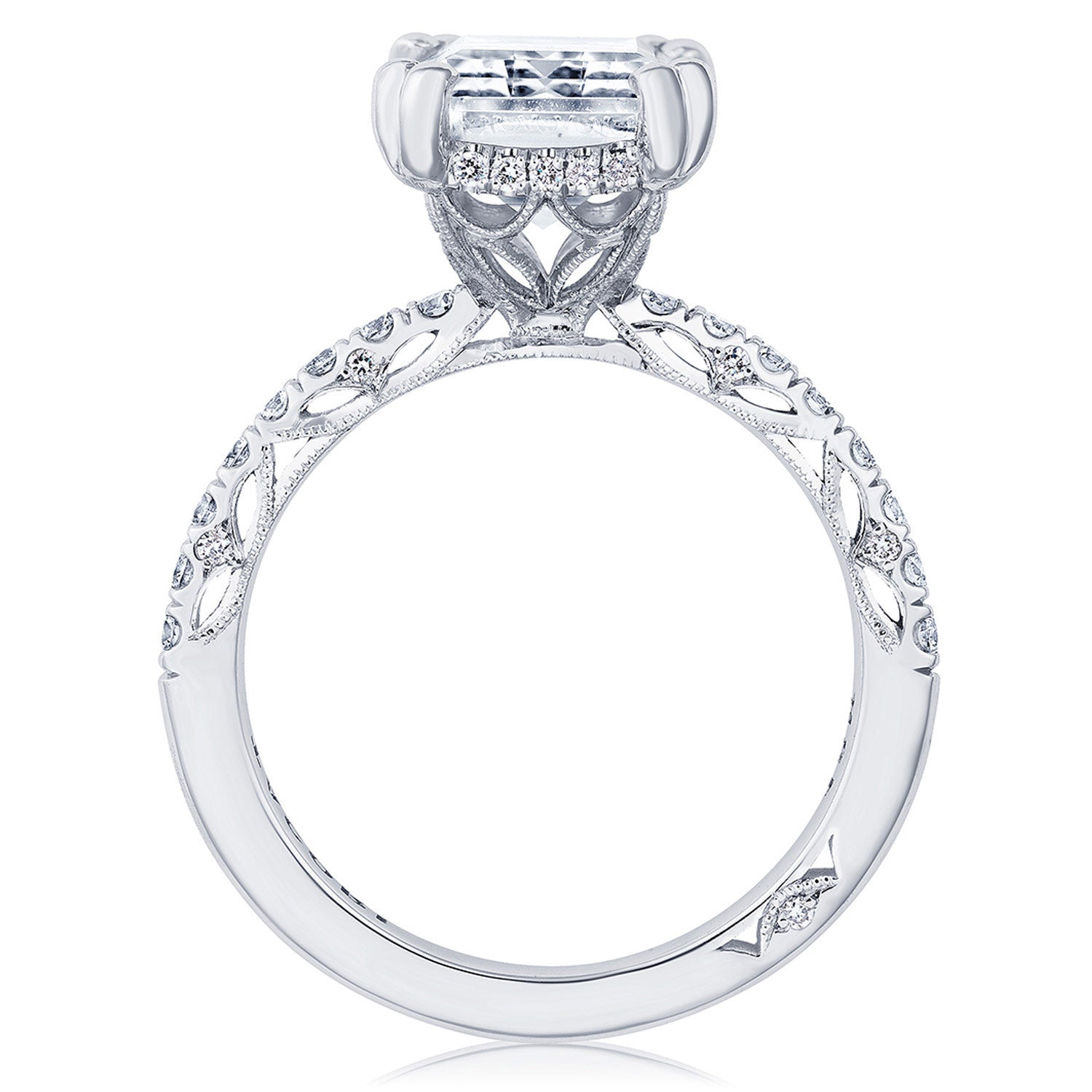 A French pavé ceiling adds dimensional light, while a hidden bloom and open air crown work illuminates the center stone. A complex and alluring lace-like Crescent Fabric gives stunning texture to the inner face profile.
