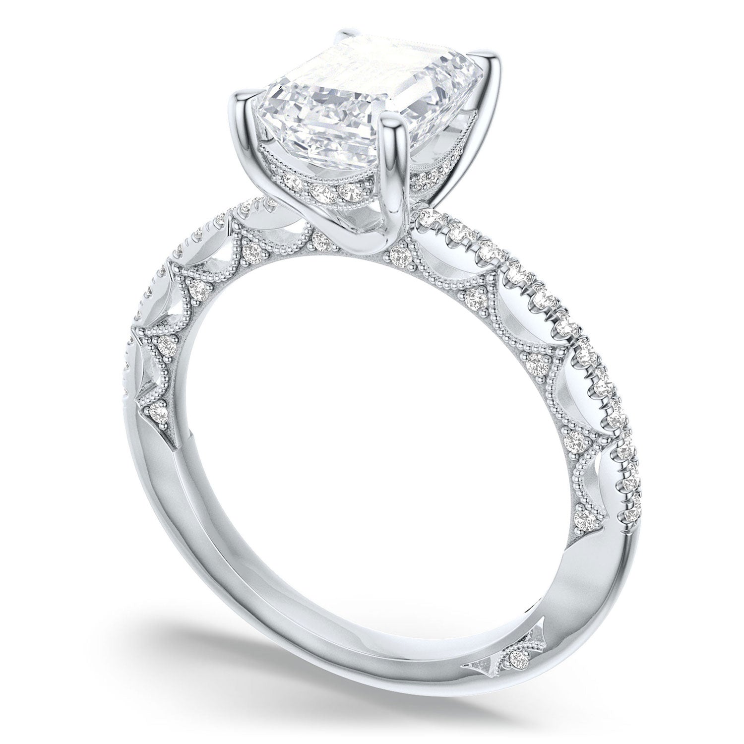 Milgrain-edged Crescents glow across the inner face, while round-brilliant diamonds, hand-set with triple beading, add radiance. A pave ceiling traces towards the center stone, which floats above a hidden bloom on a Classic 360 foundation.