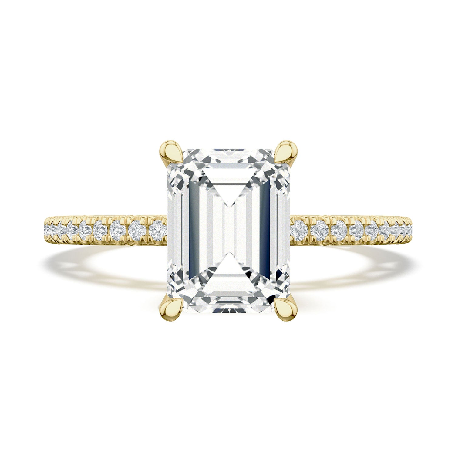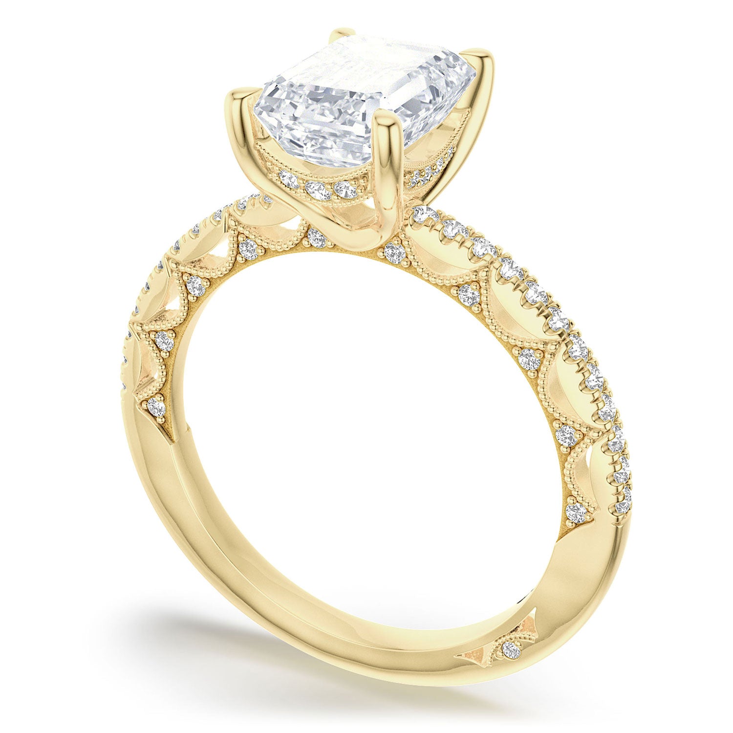 Milgrain-edged Crescents glow across the inner face, while round-brilliant diamonds, hand-set with triple beading, add radiance. A pave ceiling traces towards the center stone, which floats above a hidden bloom on a Classic 360 foundation.