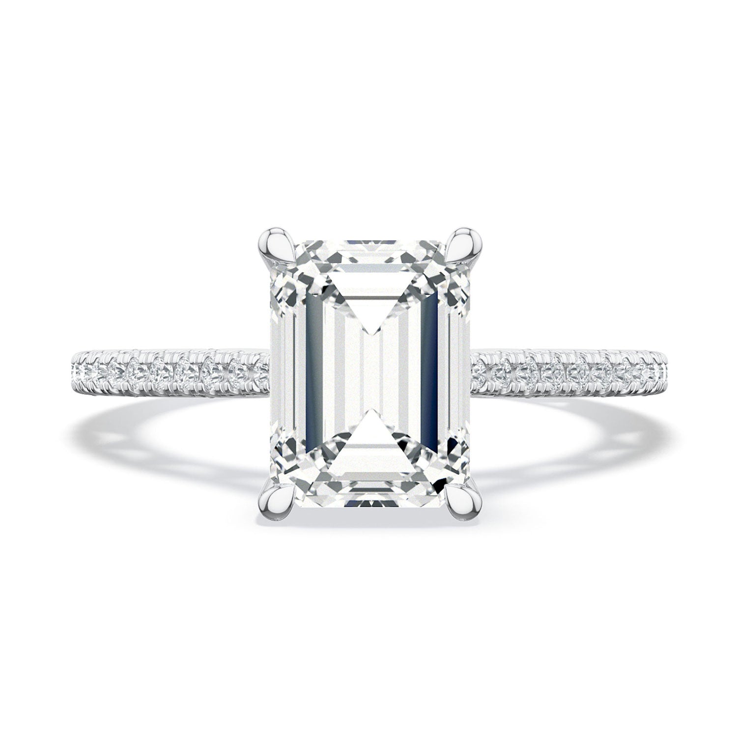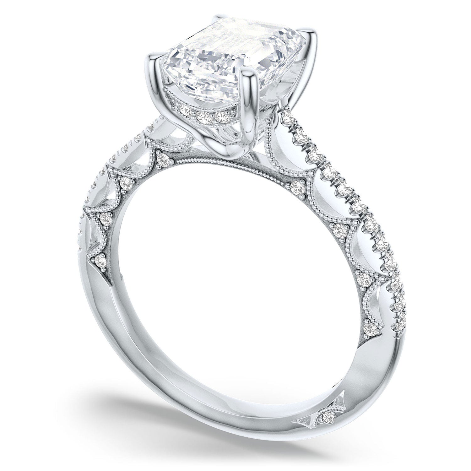 Milgrain-edged Crescents glow across the inner face, while round-brilliant diamonds, hand-set with triple beading, add radiance. A pave ceiling traces towards the center stone, which sits above a hidden bloom on a Cathedral foundation.