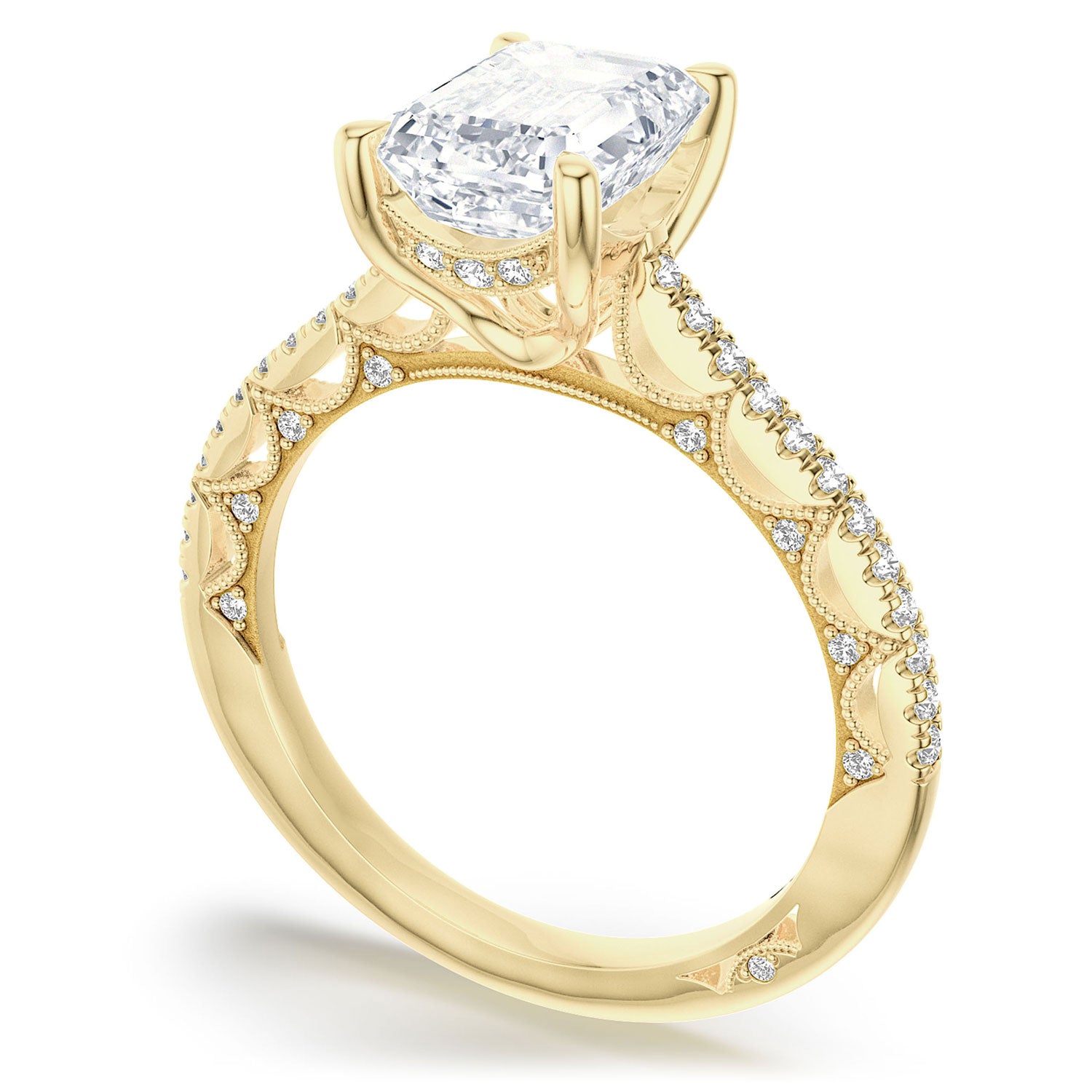 Milgrain-edged Crescents glow across the inner face, while round-brilliant diamonds, hand-set with triple beading, add radiance. A pave ceiling traces towards the center stone, which sits above a hidden bloom on a Cathedral foundation.