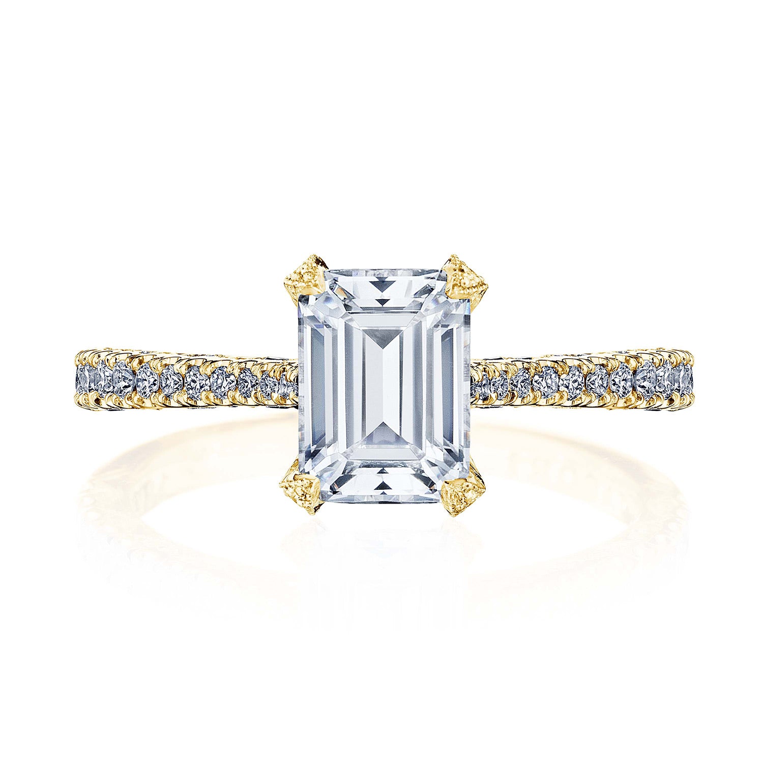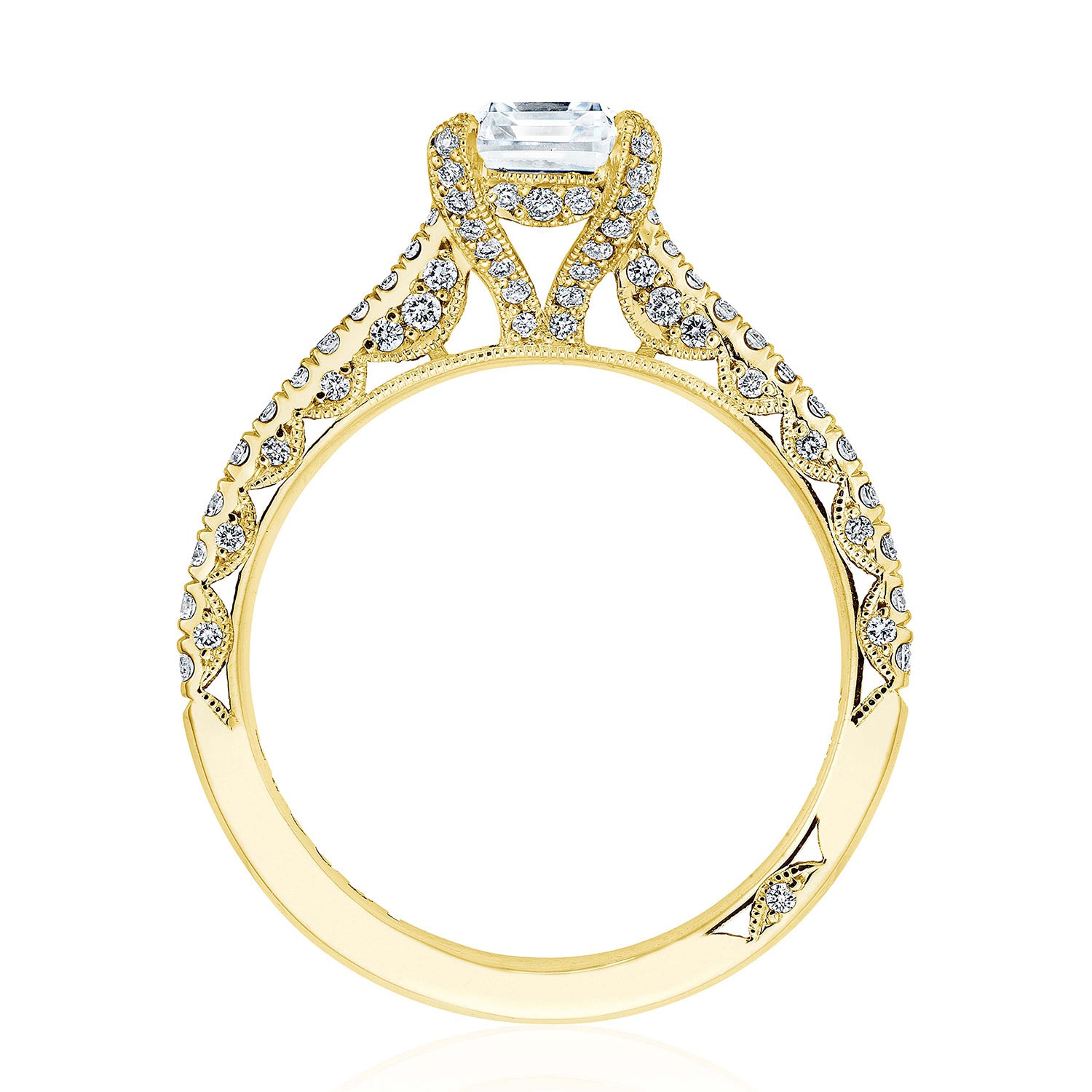 Pave-set diamonds are tapered along the ceiling, leading to a center solitaire set with diamond-studded prongs of a Cathedral foundation. A hidden bloom adds sparkle beneath the crown, and Petite Crescent decorates the innerface.