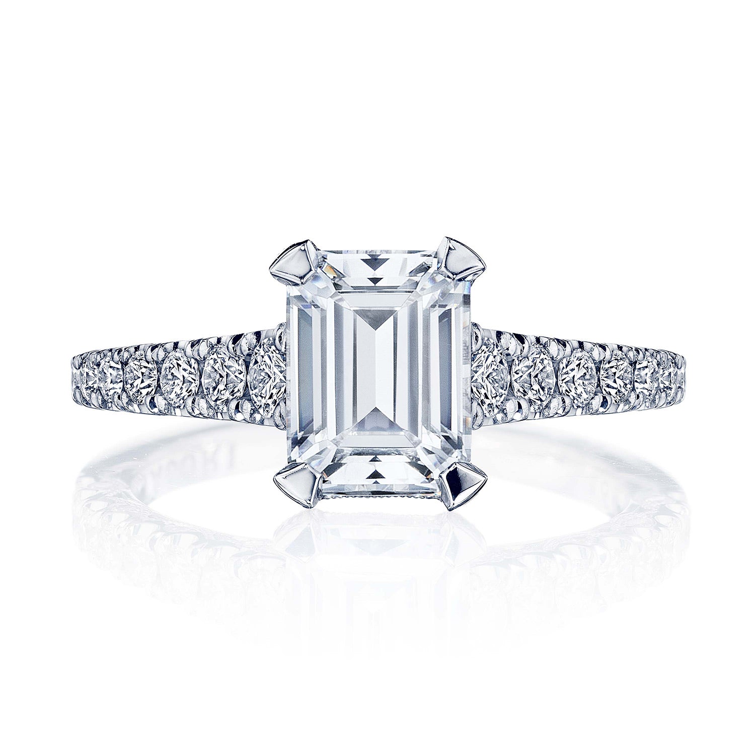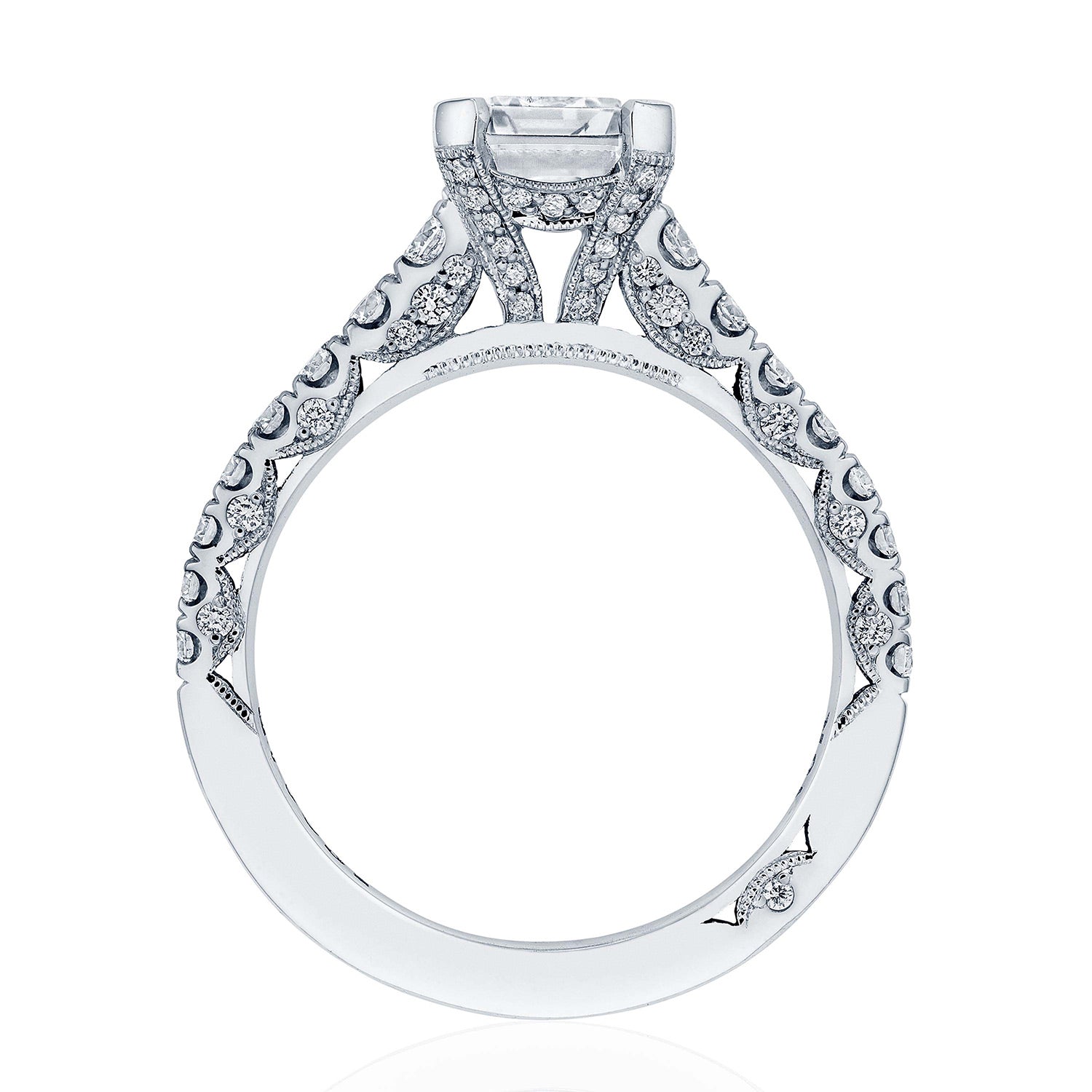 Tapering pavé-set diamonds lead up the ceiling towards the center stone, which is set on a diamond-studded Cathedral foundation above a hidden bloom and a band of Petite Crescent fabric. A Signature Crescent marks the foundation of the ring.