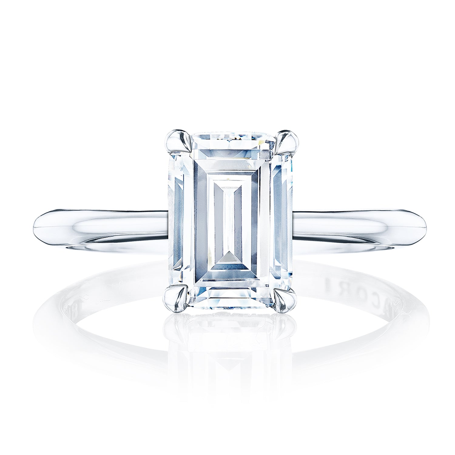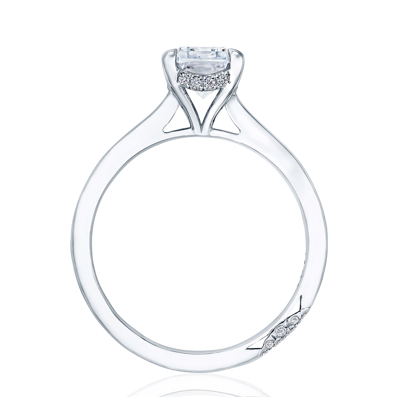 Designed by our Founder, Haig Tacorian, this stunning four-prong, solitaire engagement ring features a emerald-cut center stone on a high-polished band. Discover the hidden bloom of diamonds underneath the crown and the diamond-studded crescent signature at the foundation.