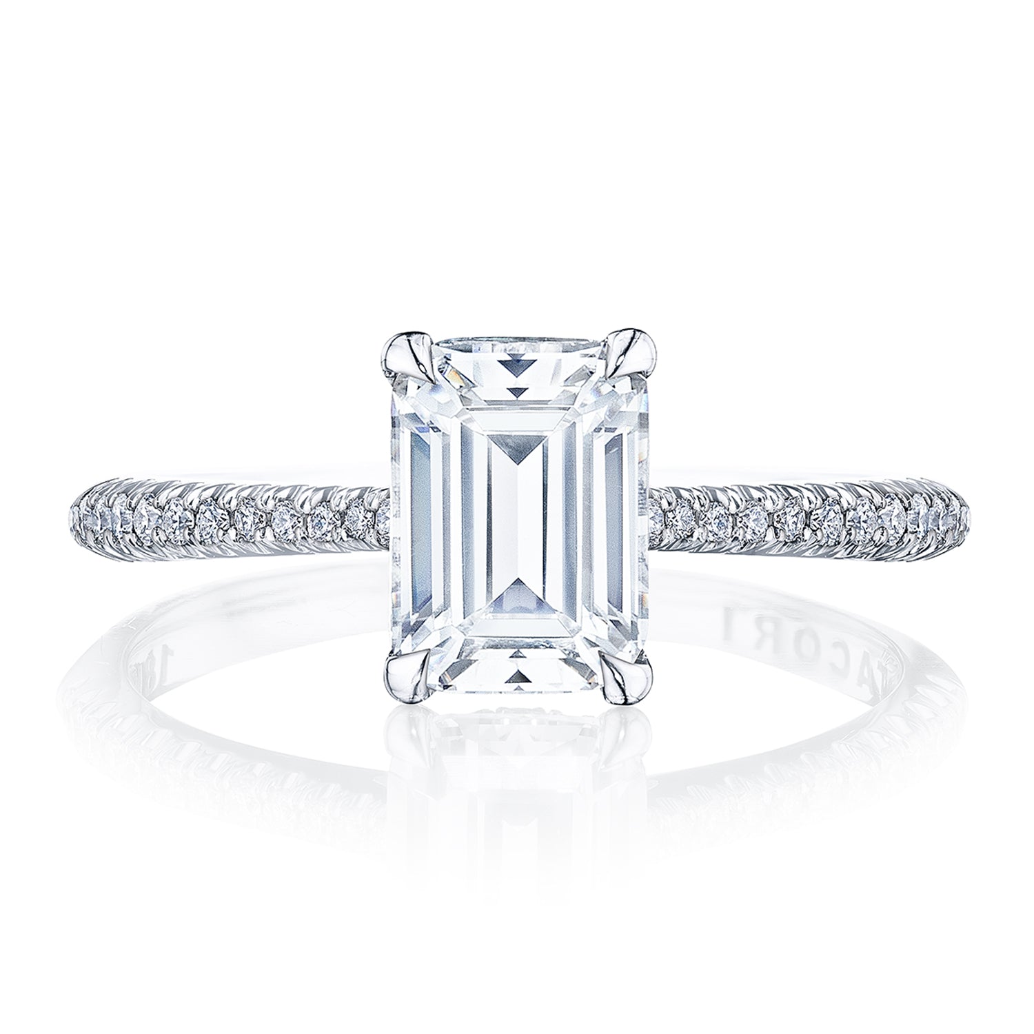 Designed by our Founder, Haig Tacorian, this stunning four-prong, solitaire engagement ring features a emerald-cut center stone on a French-pavé set diamond band. Discover the hidden bloom of diamonds underneath the crown and the diamond-studded crescent signature at the foundation.