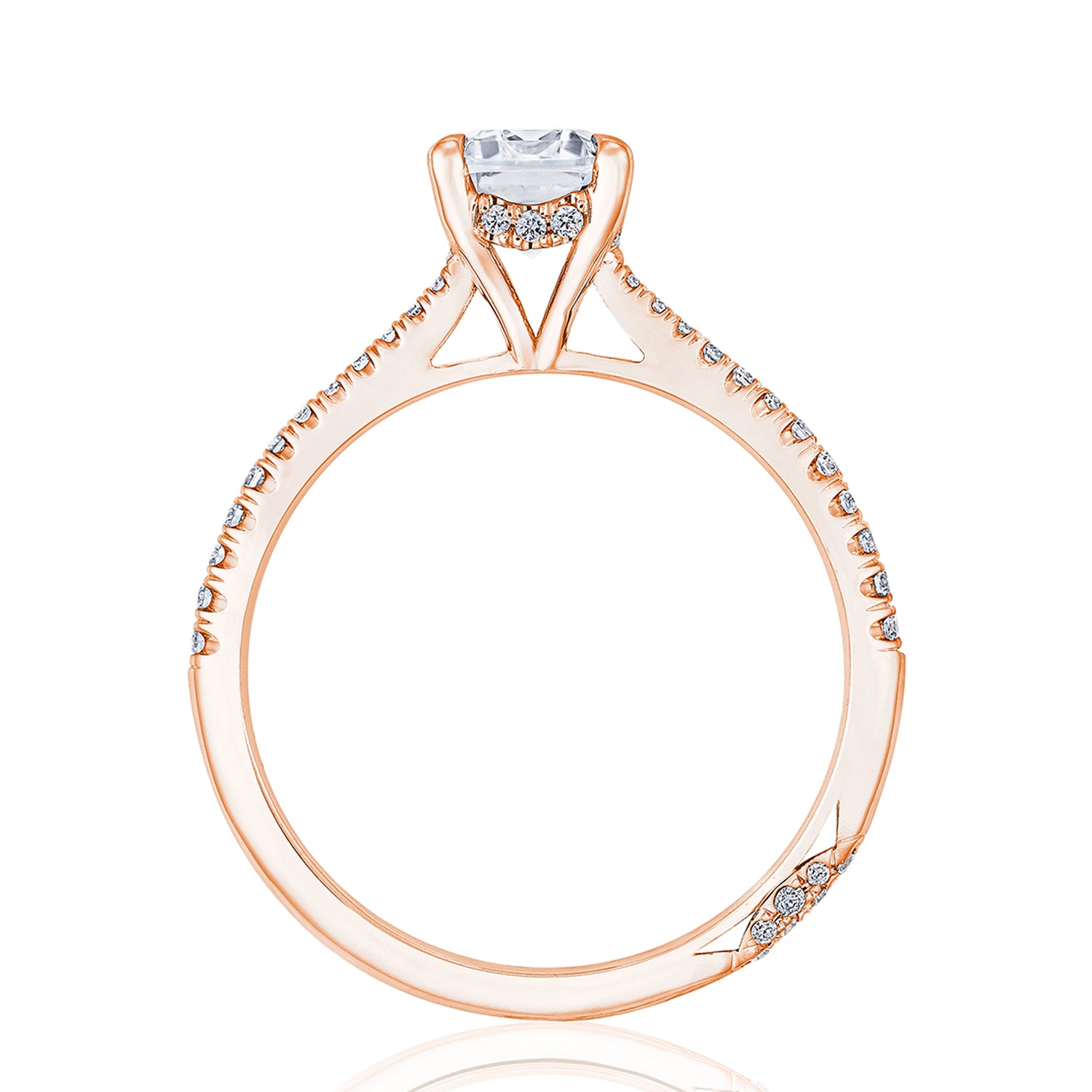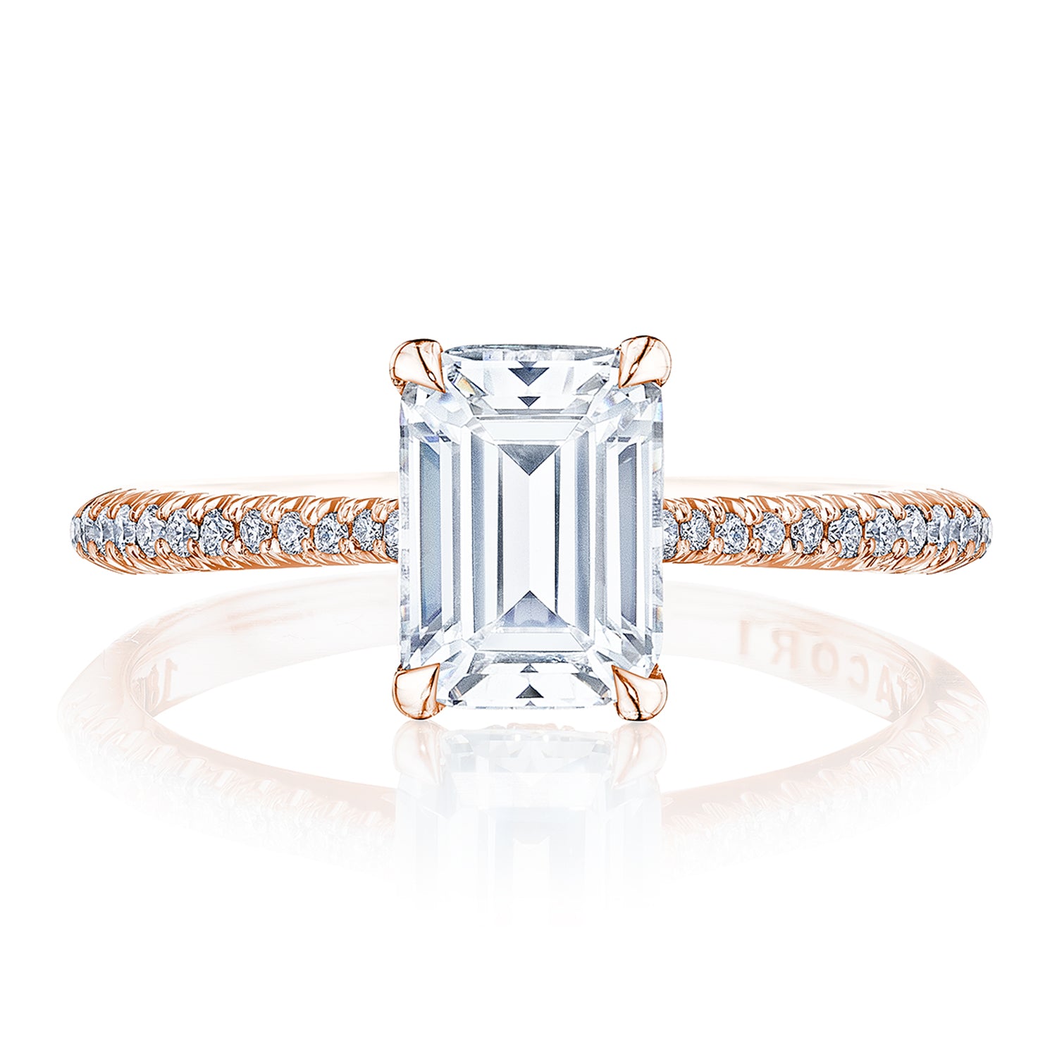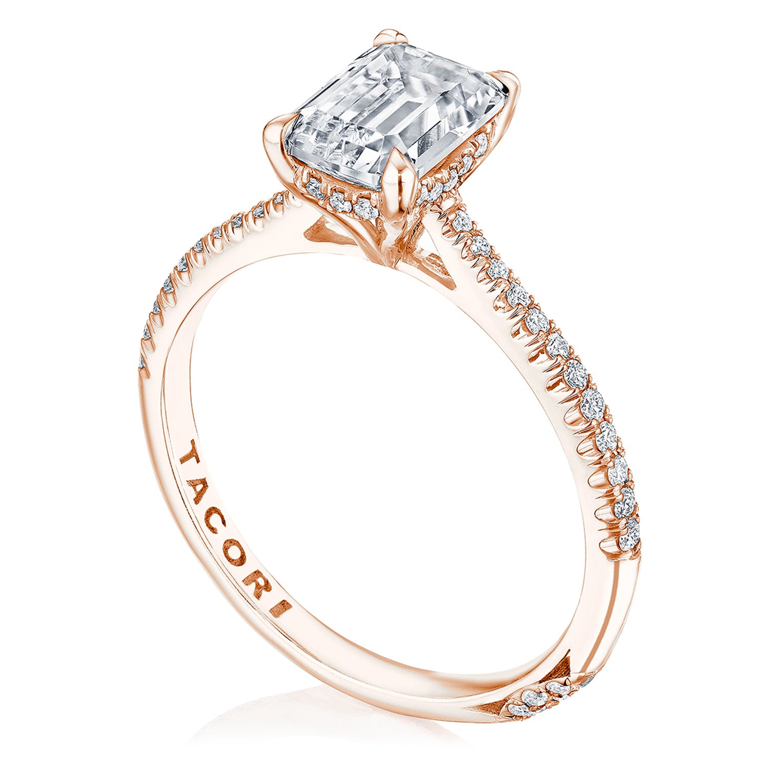 Designed by our Founder, Haig Tacorian, this stunning four-prong, solitaire engagement ring features a emerald-cut center stone on a French-pavé set diamond band. Discover the hidden bloom of diamonds underneath the crown and the diamond-studded crescent signature at the foundation.