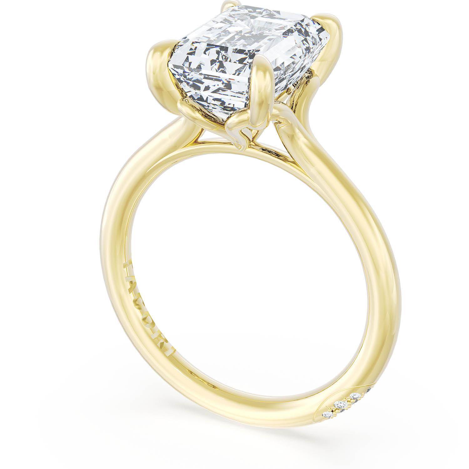 An Emerald Solitaire is set into a unique corset-inspired crown on a high-polish 18kt Yellow Gold foundation. A diamond-studded Founder's Crescent marks the resting point.