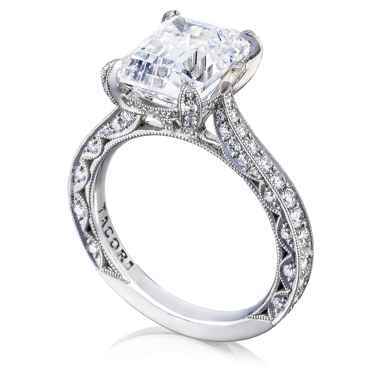 All eyes will be on your center diamond, in this not so simple solitaire emerald cut diamond engagement ring. A sleek band with pavé set diamonds brings your brilliant emerald cut diamond to life, making it worthy of your love.