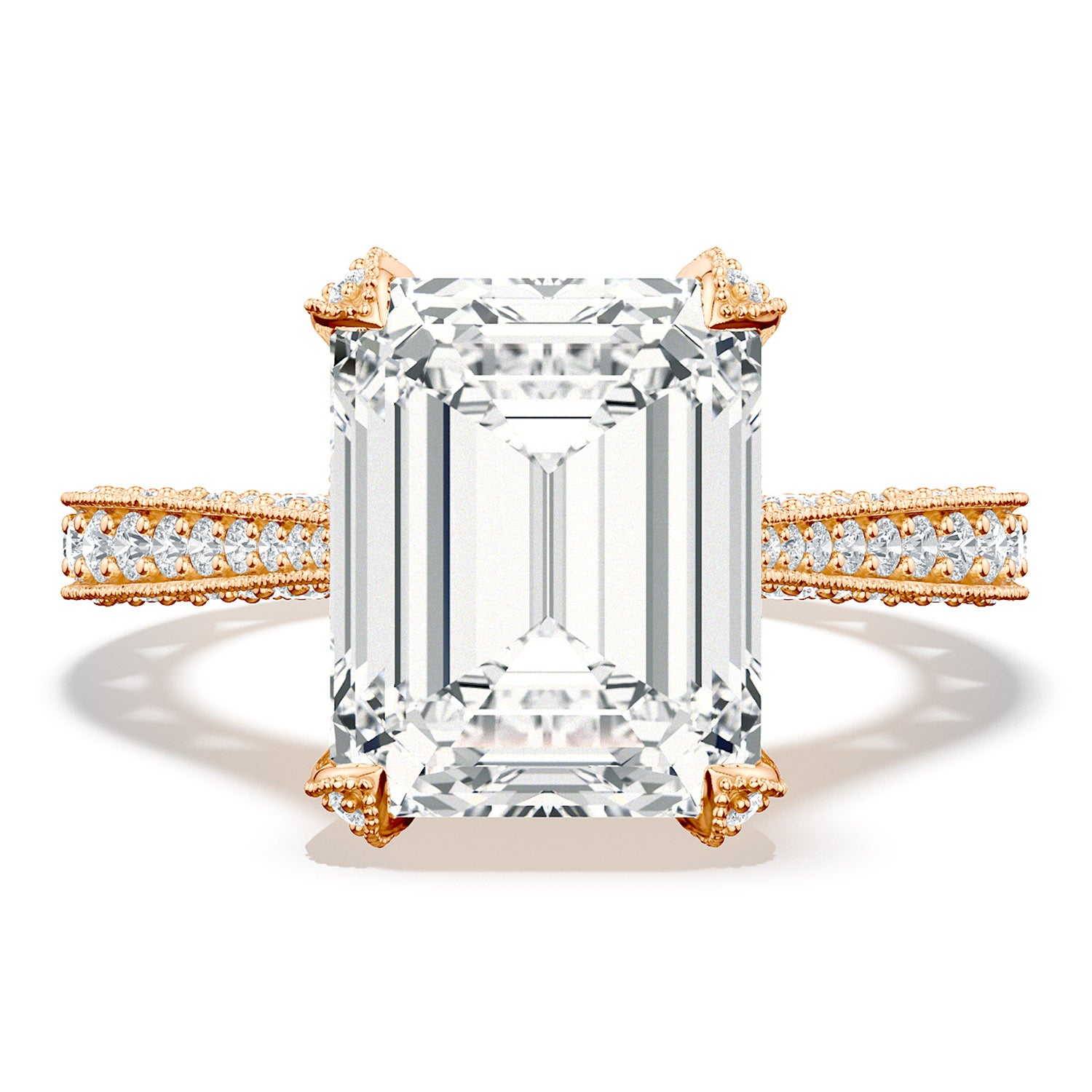 All eyes will be on your center diamond, in this not so simple solitaire emerald cut diamond engagement ring. A sleek band with pavé set diamonds brings your brilliant emerald cut diamond to life, making it worthy of your love.
