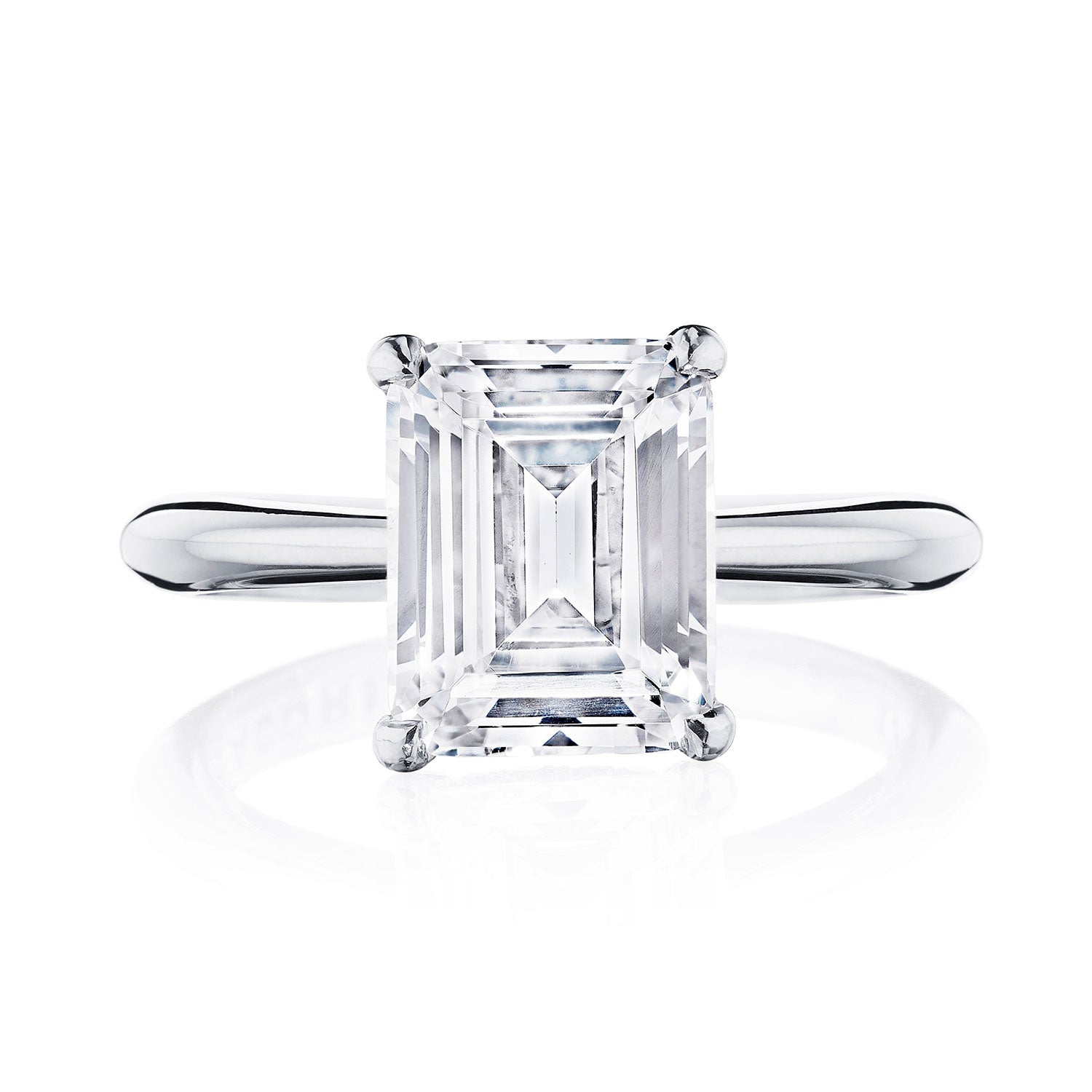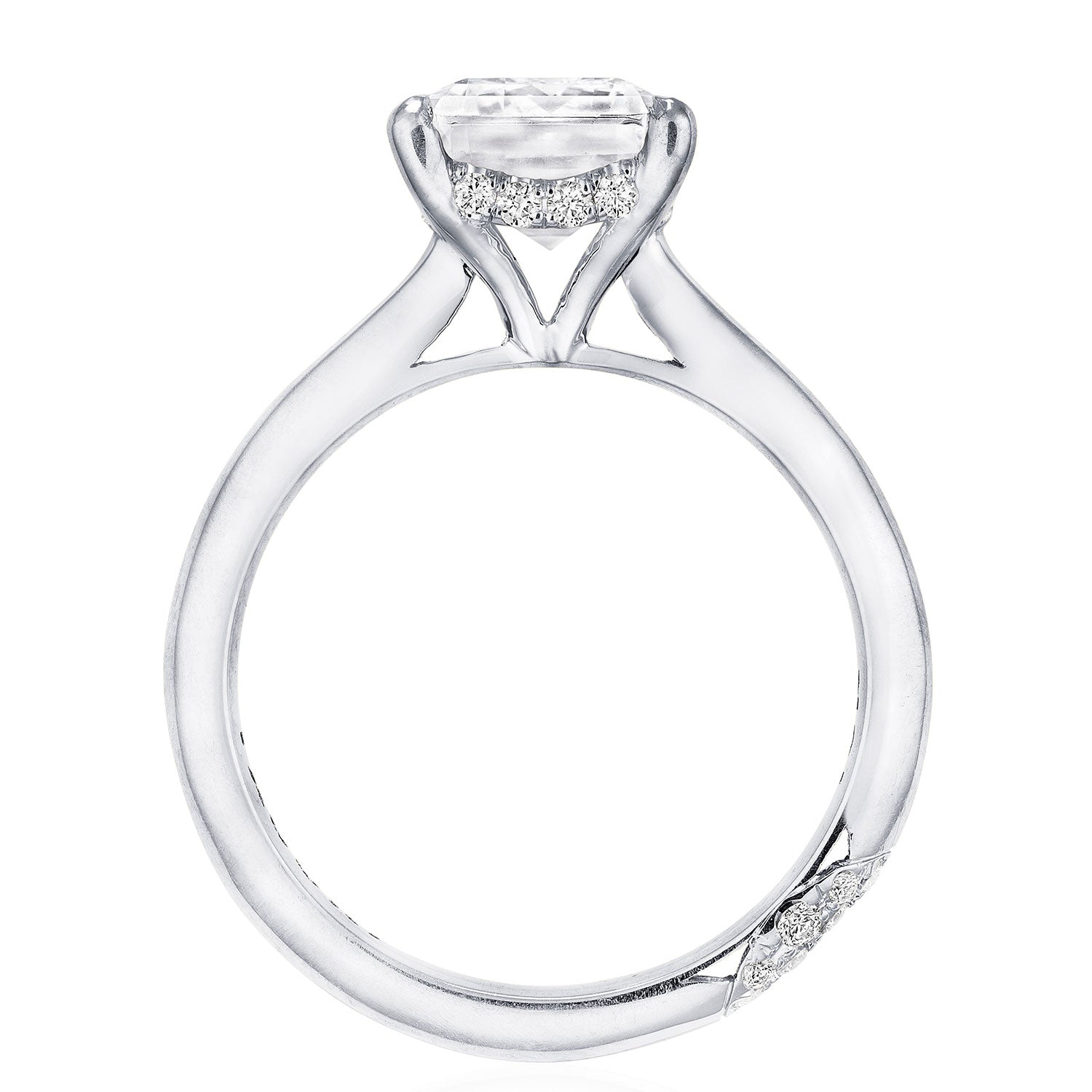 Designed by our Founder, Haig Tacorian, this stunning four-prong, solitaire engagement ring features a emerald-cut center stone on a high-polished band. Discover the hidden bloom of diamonds underneath the crown and the diamond-studded crescent signature at the foundation.