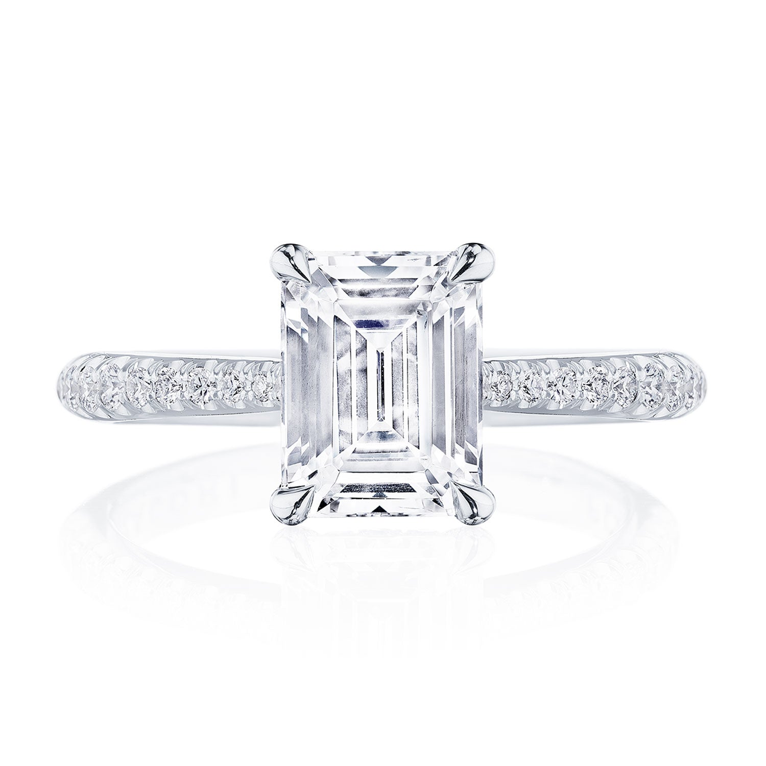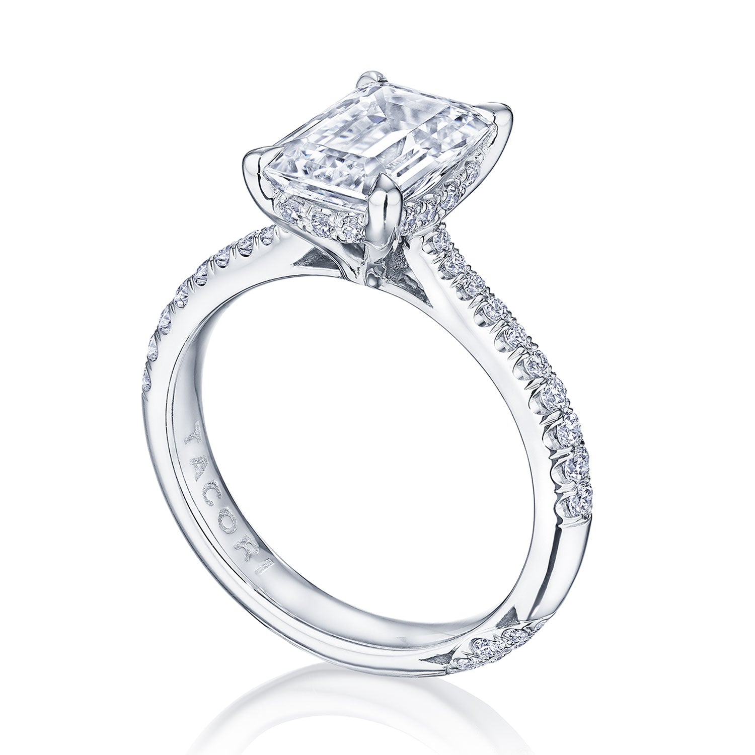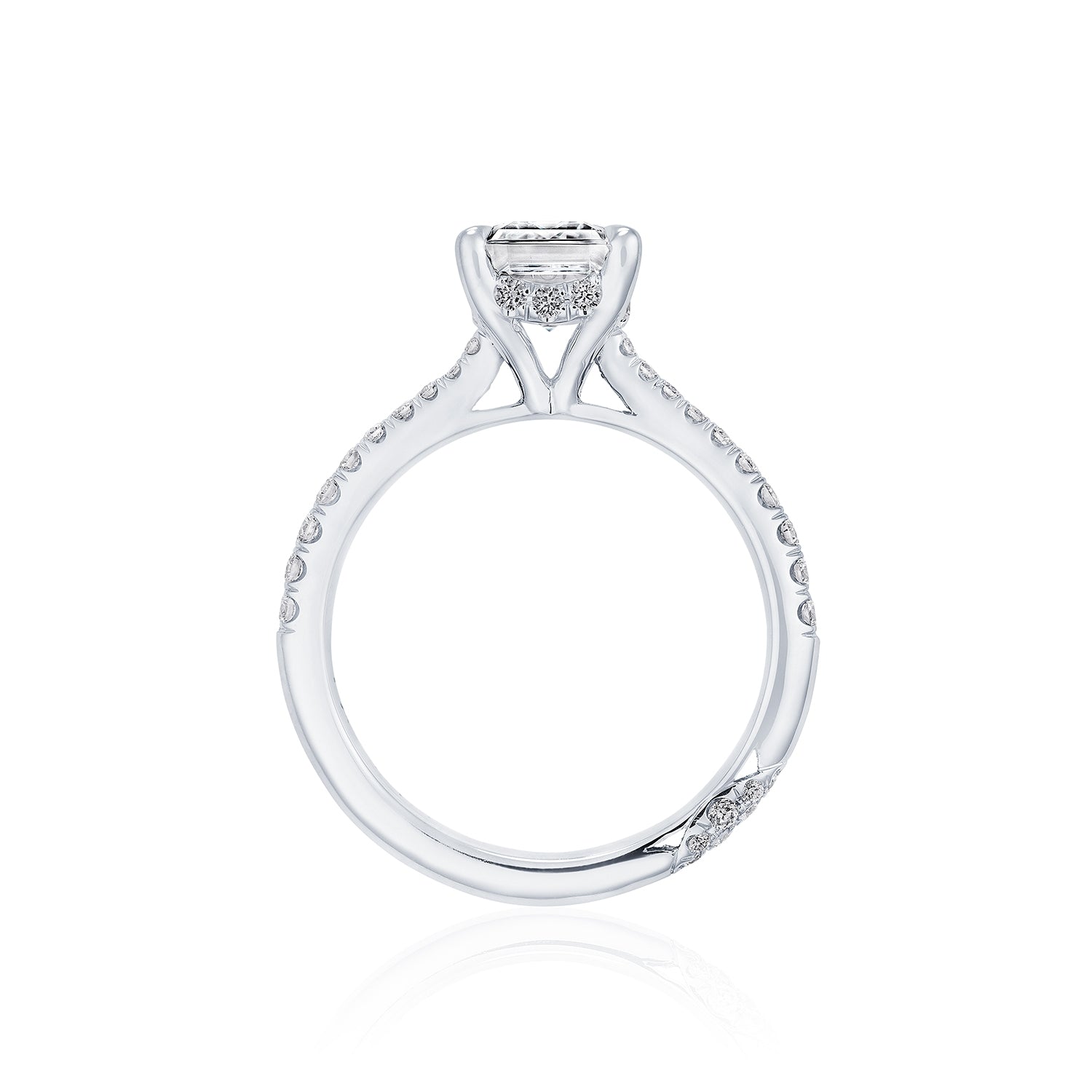 Designed by our Founder, Haig Tacorian, this stunning four-prong, solitaire engagement ring features a emerald-cut center stone on a diamond-intense band. Discover the hidden bloom of diamonds underneath the crown and the diamond-studded crescent signature at the foundation.
