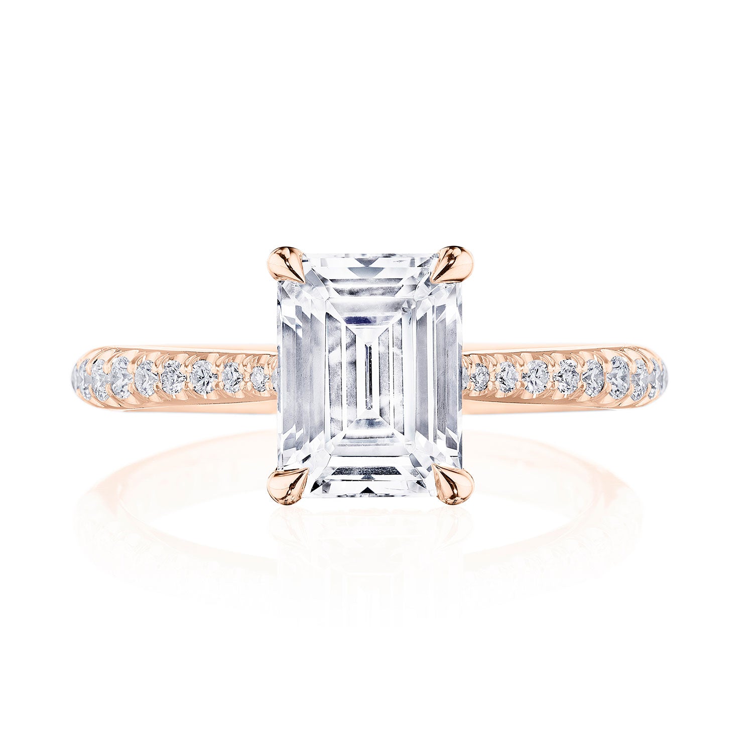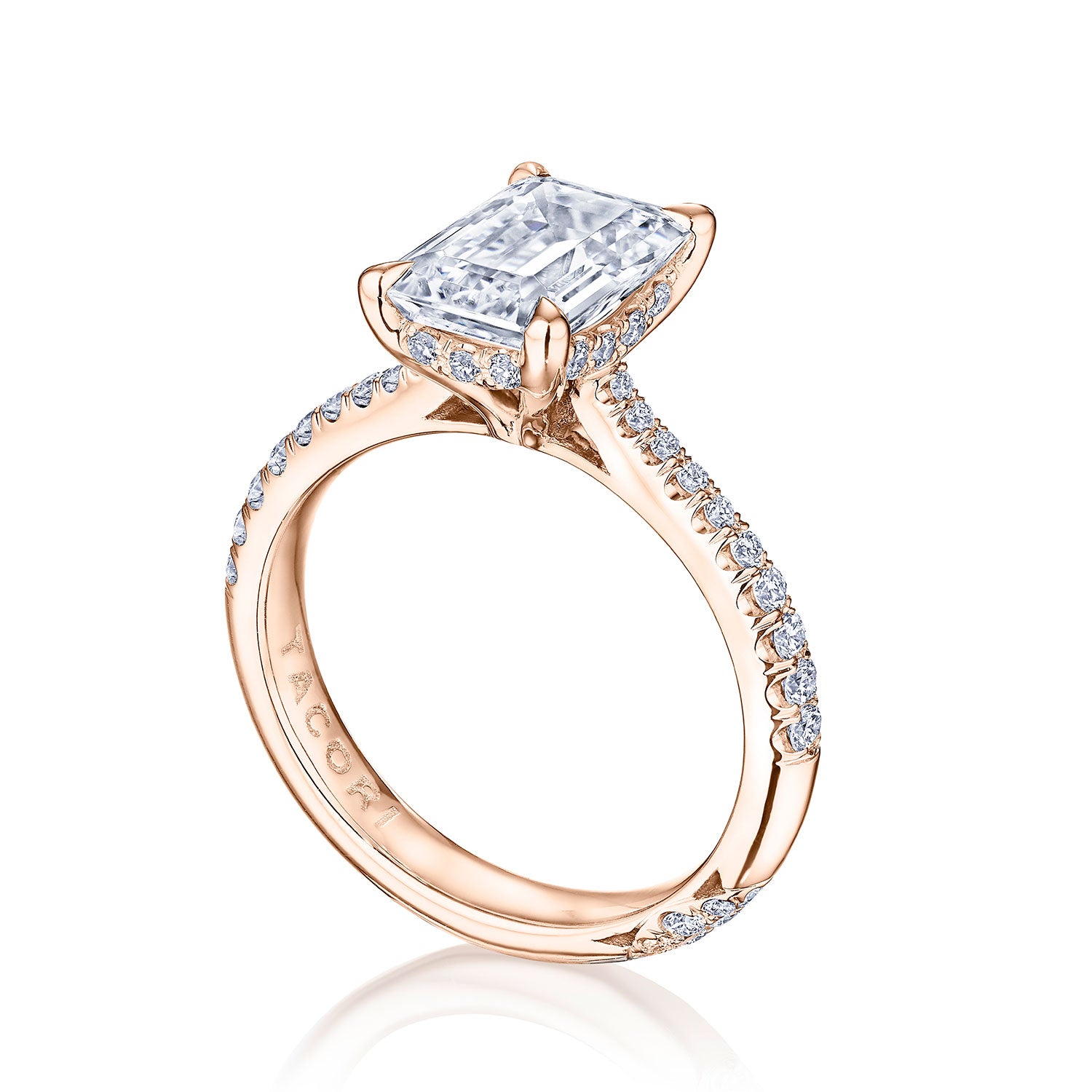 Designed by our Founder, Haig Tacorian, this stunning four-prong, solitaire engagement ring features a emerald-cut center stone on a diamond-intense band. Discover the hidden bloom of diamonds underneath the crown and the diamond-studded crescent signature at the foundation.