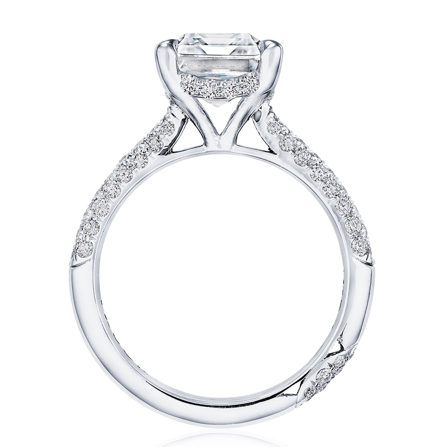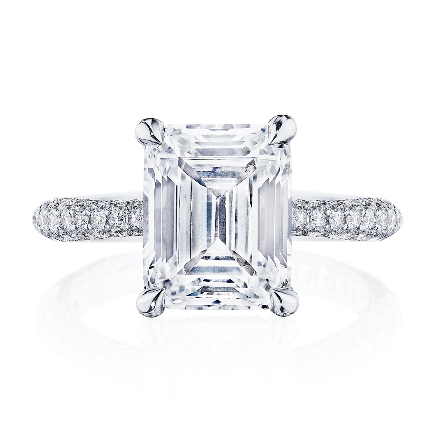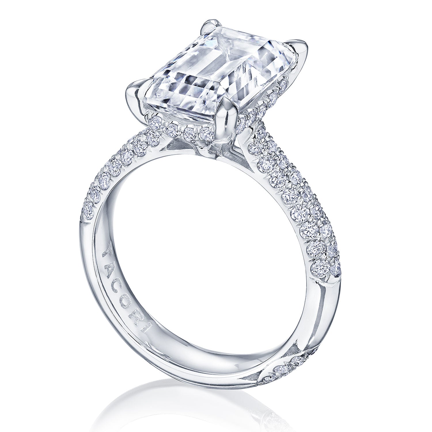 Designed by our Founder, Haig Tacorian, this stunning four-prong, solitaire engagement ring features a emerald-cut center stone on a three-row pavé-set, diamond-intense band. Discover the hidden bloom of diamonds underneath the crown and the diamond-studded crescent signature at the foundation.