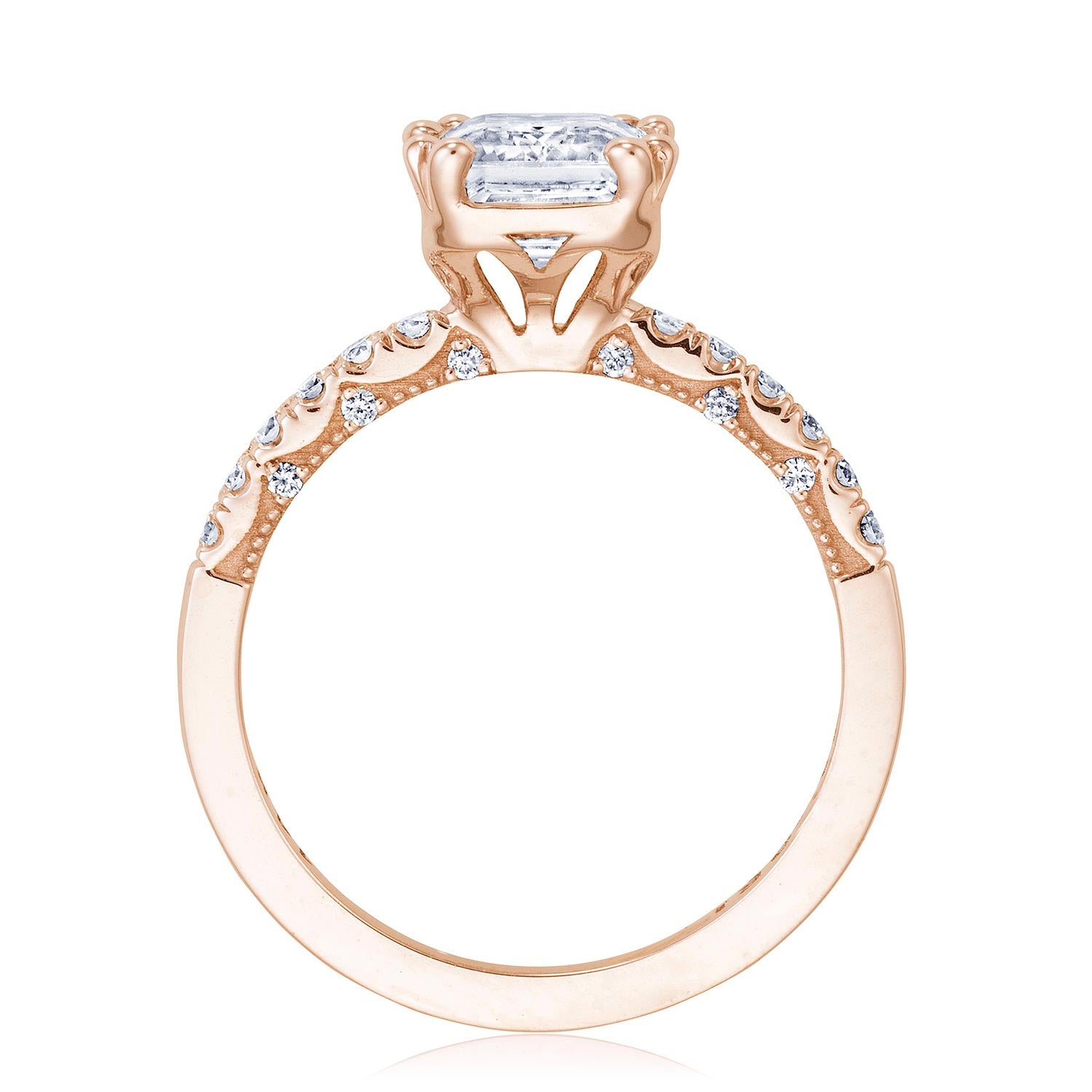 Less metal, means more scene-stealing diamond action. An emerald cut diamond solitaire rests gently on a diamond band with french pavé, revealing more diamond than metal. This ring features the Coastal Crescent inner face with pinpoint diamond details for a truly regal look.