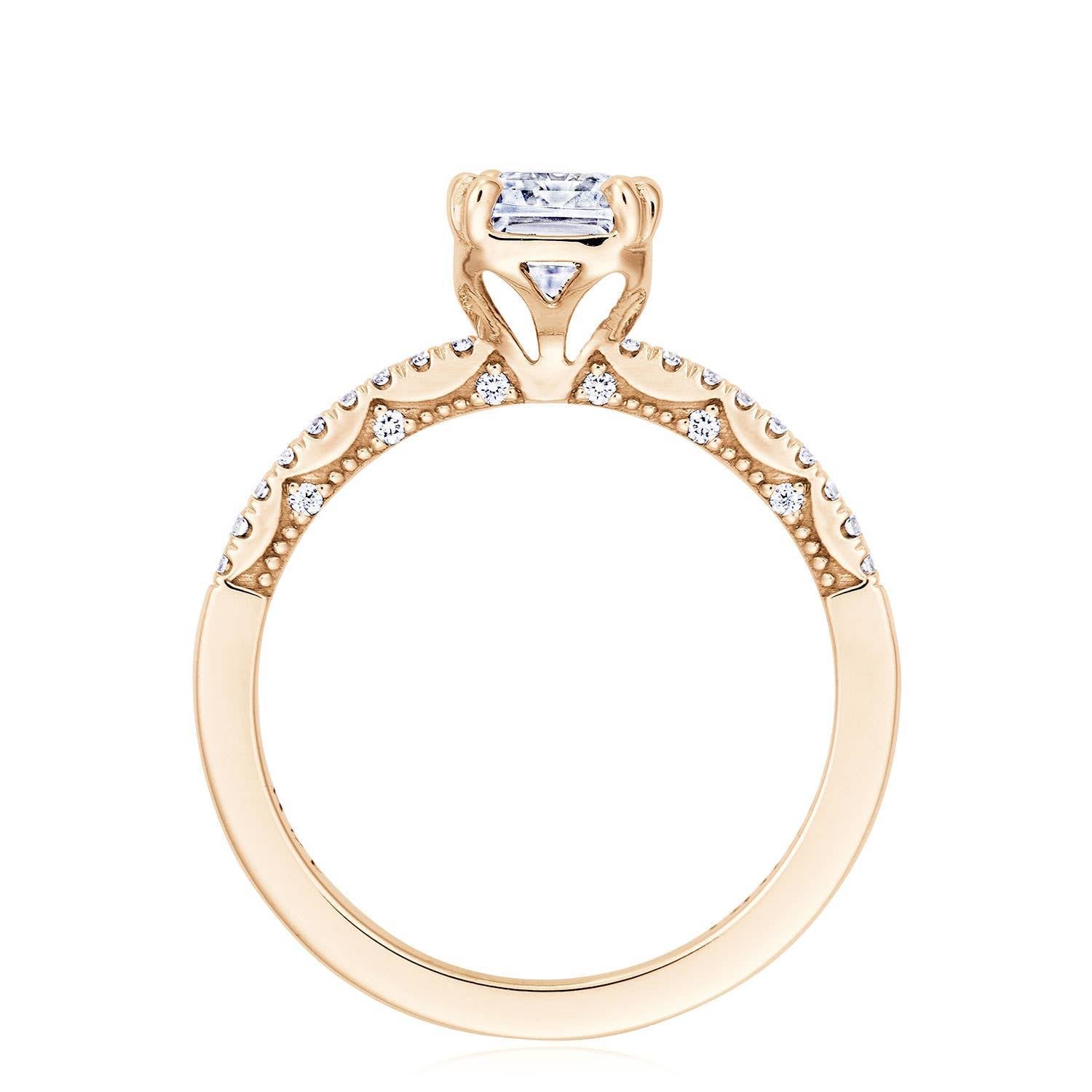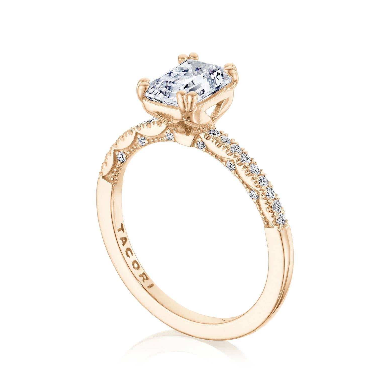 Less metal, means more scene-stealing diamond action. An emerald cut diamond solitaire rests gently on a diamond band with french pavé, revealing more diamond than metal. This ring features the Coastal Crescent inner face with pinpoint diamond details for a truly regal look.