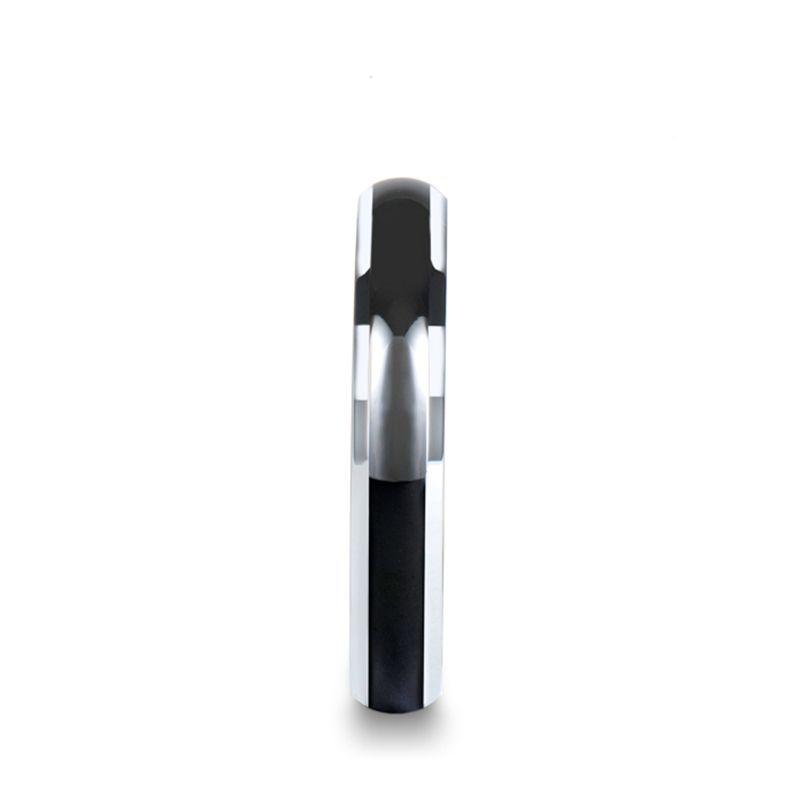 This unique cobaltfree tungsten carbide wedding band from our Women's Tungsten Rings collection has a black finish on its domed surface and contrasting polish finished beveled white tungsten edges. The style makes it a one of a kind ring, just like that special lady in your life.