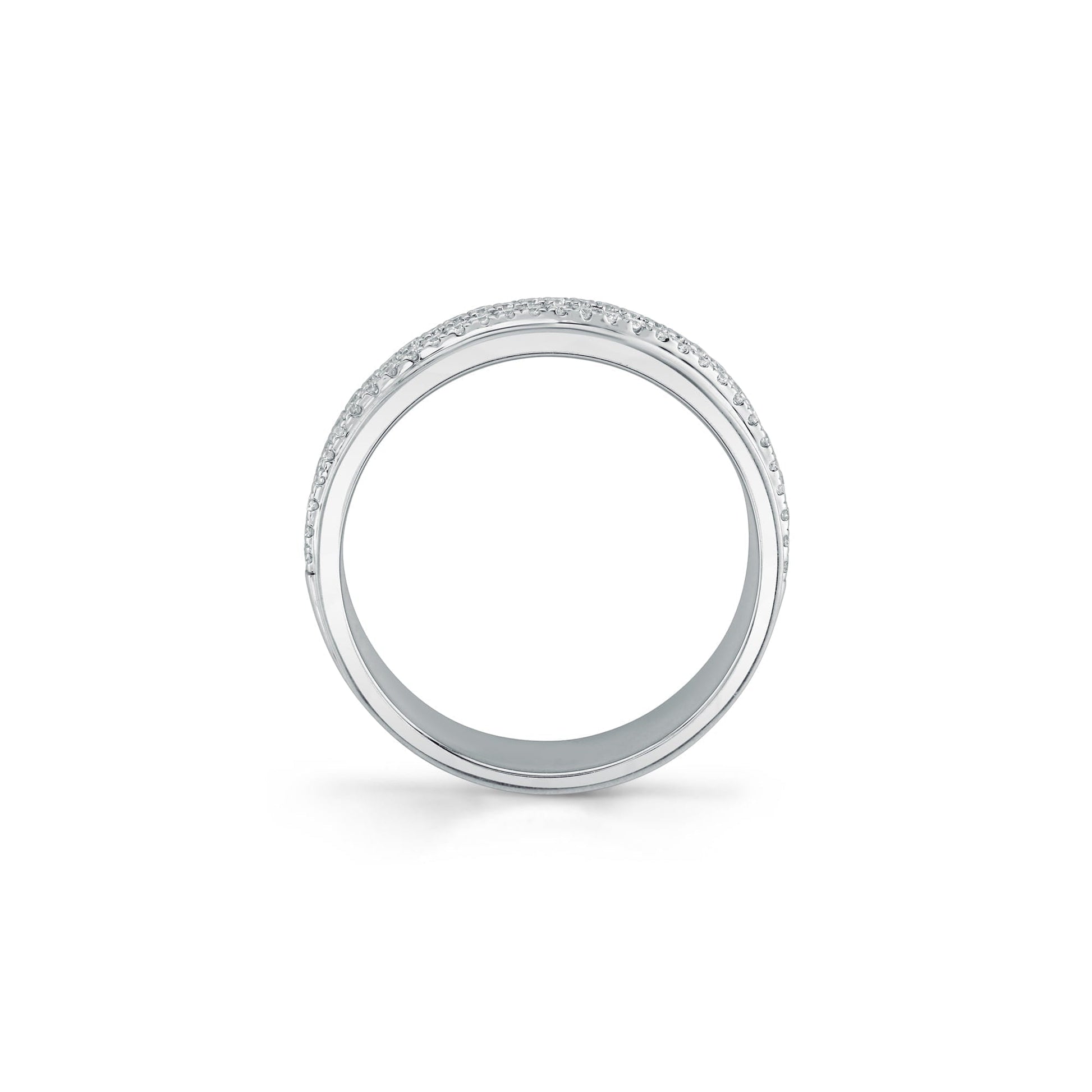 The Europa Diagonal Ring showcases a sophisticated design with an 8mm wide flat band that provides a bold yet refined presence on the finger. Its standout feature is the three rows of pave stones that elegantly cross over each other, creating a dynamic and sparkling effect. This expertly crafted ring combines modern style with timeless elegance, making it a versatile piece suitable for both everyday wear and special occasions.